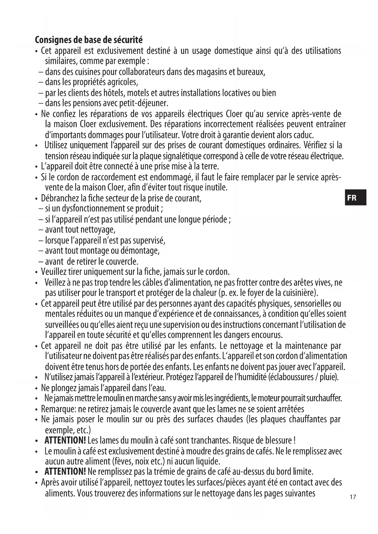 - Ne confiez les réparations de vos appareils électriques Cloer qu’au service après-vente de la maison Cloer exclusivement. Des réparations incorrectement réalisées peuvent entraîner d‘importants dommages pour l‘utilisateur. Votre droit à garantie devient alors caduc.
