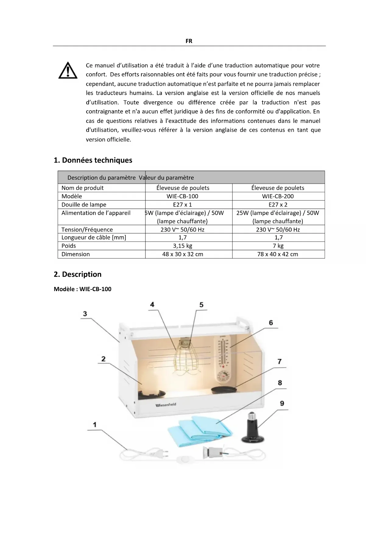 Modèle : WIE-CB-100FR 1 – Câble d’alimentation 2 – Abreuvoir à volaille à boule 3 – Logement 4 – Couvercle anti-brûlure 5 – Lampe avec variateur 6 – Thermomètre 7 – Gamelle 8 – Tapis de sol 9 – Lampe chauffante avec variateur Modèle : WIE-CB-200 1 – Tapis de sol 2 – Abreuvoir à volaille de type boule 3 – Logement 4 – Couvercle anti-brûlure 5 – Lampe chauffante avec variateur 6 – Thermomètre 7 – Lampe avec variateur 8 – GamelleFR