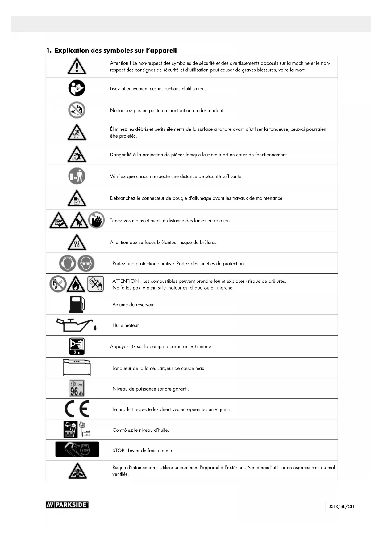 Appuyez 3x sur la pompe à carburant «Primer». Longueur de la lame. Largeur de coupe max. Niveau de puissance sonore garanti. Le produit respecte les directives européennes en vigueur. MIN MAX Contrôlez le niveau d’huile. STOP MOTOR STOP - Levier de frein moteur Risque d’intoxication! Utiliser uniquement l'appareil à l’extérieur. Ne jamais l’utiliser en espaces clos ou mal ventilés.34 FR/BE/CH m Attention! Dans ces instructions d’utilisation, nous avons signalé les points qui concernent votre sécurité par ce signe. DANGER! Terme de signalisation servant à désigner une situation de danger immédiate qui entraîne des blessures graves voire mortelles si elle n’est pas évitée. AVERTISSEMENT! Terme de signalisation servant à désigner une situation de danger possible qui peut entraîner des blessures graves voire mortelles si elle n’est pas évitée. PRUDENCE! Terme de signalisation servant à désigner une situation de danger possible qui peut entraîner des blessures légères ou modérées si elle n’est pas évitée. REMARQUE Terme de signalisation servant à désigner une situation de danger possible qui peut endommager le produit ou les biens environnants.35FR/BE/CH