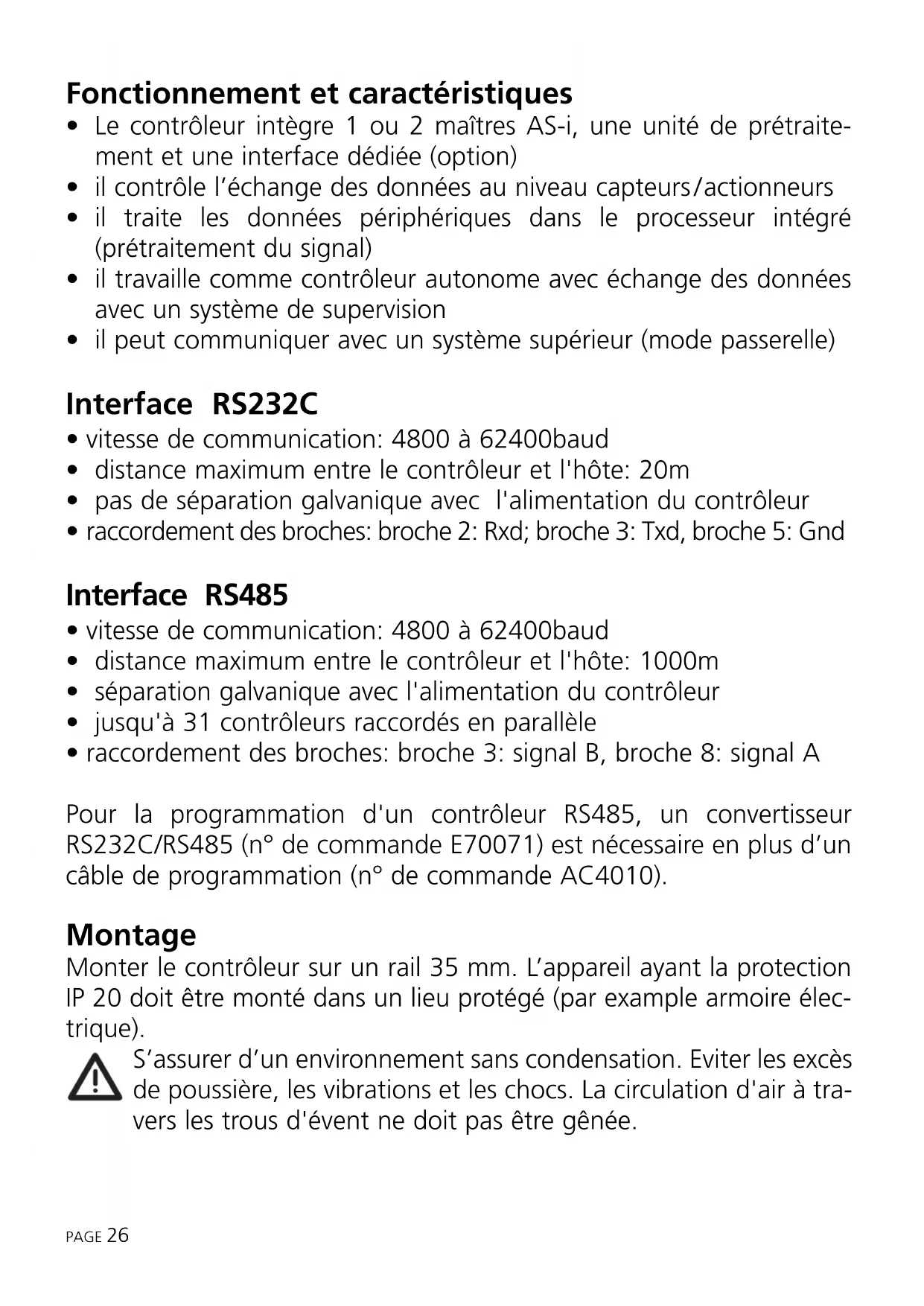 Affichage blocage actif Affichage du mode sélectionné Appuyer 1 fois (= confirmation)Messages d’erreur PAGE 35 Affichage d’esclaves manquants/défectueux (segment 2 = maître, segments 3 et 4 = no. d’esclave); les esclaves sont affichés dans des intervalles de secondes. La liste des esclaves défaillants peut être sauvegardée jusqu’à ce que les esclaves soient remplacés. - Appuyer sur le bouton SET 2 fois (pour la liste du maître 1) ou SET - MODE - SET (pour la liste du maître 2). La plus basse adresse de la liste d’erreurs est affi- chée en clignotant. - Remplacer l’esclave défaillant par un esclave iden- tique portant l’adresse 0; il reçoit l’adresse affichée; (la fonction «adressage multiple automatique» doit être activée). Si d’autres adresses sont affichées continuer de la même façon jusqu’à ce que la liste soit complétée. - La fonction sera terminée si les esclaves sont rem- placés ou si le bouton SET est appuyé. Erreur ou délai d'attente trop long sur réseau Version soft faisceau AS-i 1 ≠ faisceau AS-i 2 Erreur à l'initialisation de l’interface Profibus Maître AS-i 2: mode de fonctionnement déjà actif Maître AS-i 2: mode d'adressage déjà actif Maître AS-i 2: erreur lors de l'affectation de la nouvelle adresse Maître AS-i 2: erreur lors de la mise à 0 de l'ancienne adresse Maître AS-i 2: esclave avec l'ancienne adresse non présent Maître AS-i 2: esclave avec la nouvelle adresse déjà présent Maître AS-i 2 offline/esclave 0 présentPAGE 36 Maître AS-i 2 pas en mode présélection Maître AS-i 2 pas en mode présélection Maître AS-i 2 pas en mode présélection/ Données de configuration non valables Maître AS-i 2 pas en mode présélection Maître AS-i 2 offline Maître AS-i 2: valeur de paramètre non valable Maître AS-i 1: mode de fonctionnement déjà actif Maître AS-i 1: mode d'adressage déjà actif Maître AS-i 1: erreur lors de l'affectation de la nouvelle adresse Maître AS-i 1: erreur lors de la mise à 0 de l'ancienne adresse Maître AS-i 1: esclave avec l'ancienne adresse non présent Maître AS-i 1: esclave avec la nouvelle adresse déjà présent Maître AS-i 1 offline/esclave 0 présent Maître AS-i 1 pas en mode présélection Maître AS-i 1 pas en mode présélection Maître AS-i 1 pas en mode présélection Maître AS-i 1 pas en mode présélection/ Données de configuration non valables Maître AS-i 1 offlinePAGE 37 Maître 2 non présent Programme non chargé Maître AS-i 1: valeur de paramètre non valable Liste des esclaves reconnus vide (LDS) Liste des esclaves présélectionnés vide (LPS) Liste des esclaves activés vide(LAS) Pas d'adresse esclave libre Esclave 0 non présent Touches bloquées Fonction seulement accessible en mode présélection Adresse cible déjà affectée Pas d’affectation possible de la nouvelle adresse Adressage multiple automatique non actif Configuration E/S réelle ≠ configuration prévue Code ID incorrect (≠ valeur prévue) Adressage non possible, des esclaves manquent Adressage non possible, "Adressage automatique" non actif Mode protégé non actif Esclave 0 présentElectrical ratings Controllers with one master (AC1003, AC1007) Electrical ratings Controllers with two masters (AC1004, AC1017) Input Rating Output Rating 24V DC 80mA ± 3V DC Input Rating Output Rating 24V DC 80mA ± 2 x 3V DC PAGE 38