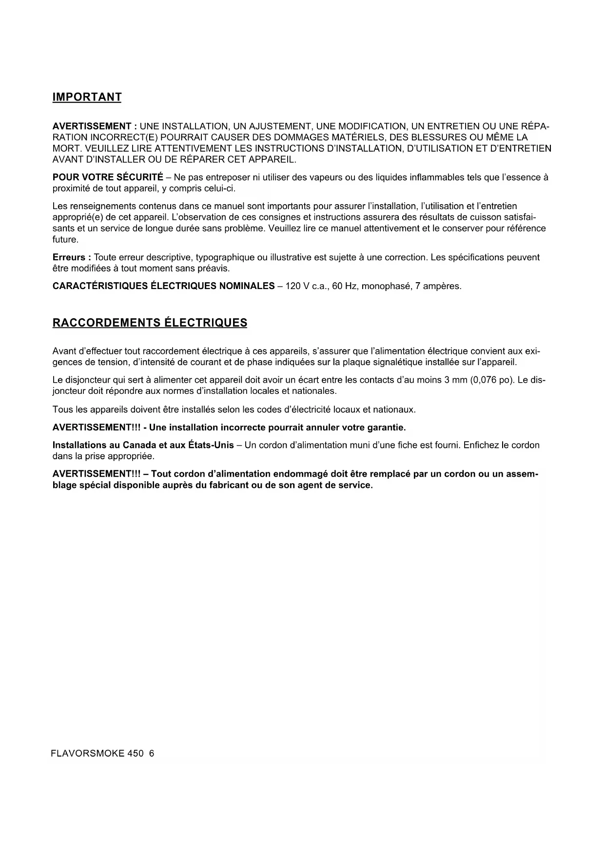 RATION INCORRECT(E) POURRAIT CAUSER DES DOMMAGES MATÉRIELS, DES BLESSURES OU MÊME LA MORT. VEUILLEZ LIRE ATTENTIVEMENT LES INSTRUCTIONS D’INSTALLATION, D’UTILISATION ET D’ENTRETIEN AVANT D’INSTALLER OU DE RÉPARER CET APPAREIL. POUR VOTRE SÉCURITÉ – Ne pas entreposer ni utiliser des vapeurs ou des liquides inammables tels que l’essence à proximité de tout appareil, y compris celui-ci. Les renseignements contenus dans ce manuel sont importants pour assurer l’installation, l’utilisation et l’entretien approprié(e) de cet appareil. L’observation de ces consignes et instructions assurera des résultats de cuisson satisfai- sants et un service de longue durée sans problème. Veuillez lire ce manuel attentivement et le conserver pour référence future. Erreurs : Toute erreur descriptive, typographique ou illustrative est sujette à une correction. Les spécications peuvent être modiées à tout moment sans préavis. CARACTÉRISTIQUES ÉLECTRIQUES NOMINALES – 120 V c.a., 60 Hz, monophasé, 7 ampères. RACCORDEMENTS ÉLECTRIQUES Avant d’eectuer tout raccordement électrique à ces appareils, s’assurer que l’alimentation électrique convient aux exi- gences de tension, d’intensité de courant et de phase indiquées sur la plaque signalétique installée sur l’appareil. Le disjoncteur qui sert à alimenter cet appareil doit avoir un écart entre les contacts d’au moins 3 mm (0,076 po). Le dis- joncteur doit répondre aux normes d’installation locales et nationales. Tous les appareils doivent être installés selon les codes d’électricité locaux et nationaux. AVERTISSEMENT!!! - Une installation incorrecte pourrait annuler votre garantie. Installations au Canada et aux États-Unis – Un cordon d’alimentation muni d’une che est fourni. Enchez le cordon dans la prise appropriée. AVERTISSEMENT!!! – Tout cordon d’alimentation endommagé doit être remplacé par un cordon ou un assem- blage spécial disponible auprès du fabricant ou de son agent de service.7 FLAVORSMOKE 450 INSTALLATION