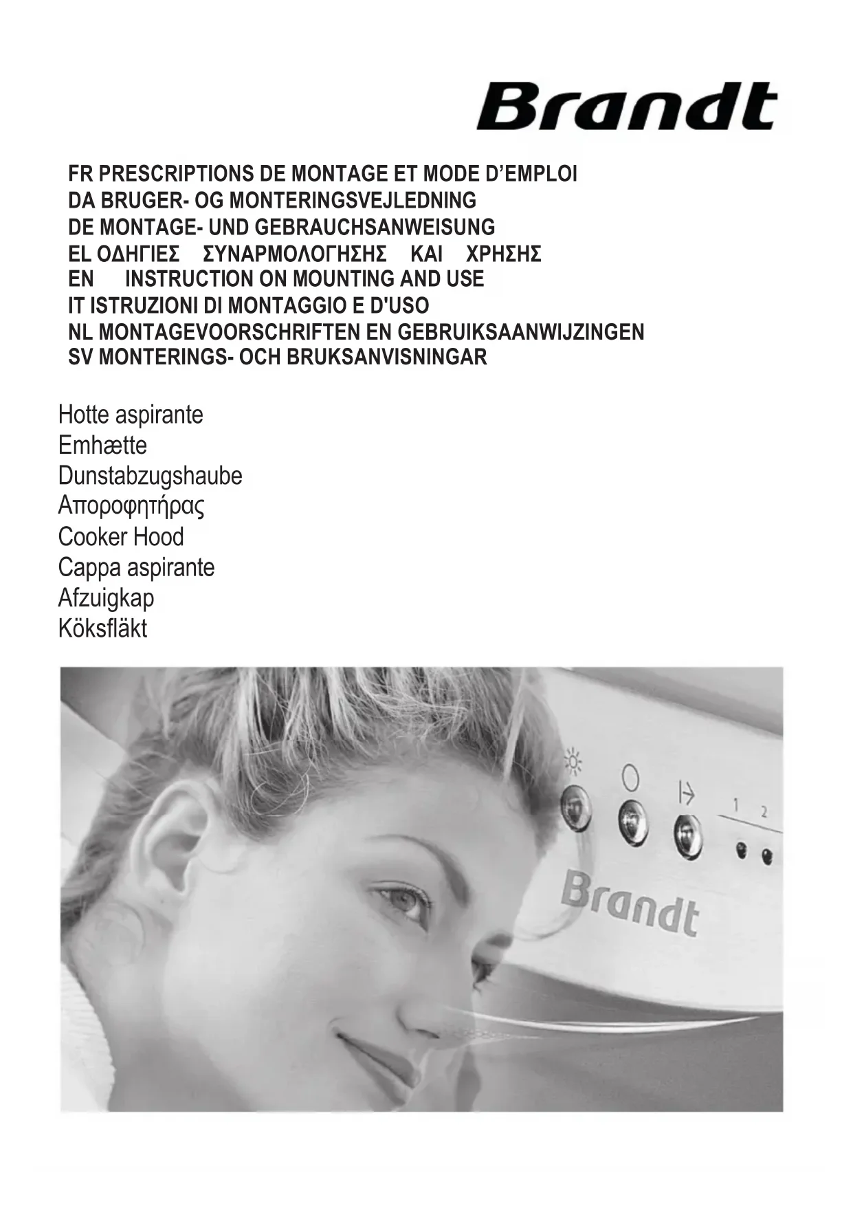Hotte aspirante Emhætte Dunstabzugshaube ǹʌȠȡȠijȘIJȒȡĮȢ Cooker Hood Cappa aspirante Afzuigkap KöksfläktChère Cliente, Cher Client, Vous venez d'acquérir une hotte BRANDT et nous vous en remercions. Nos équipes de recherche ont conçu pour vous cette nouvelle génération d'appareils, qui par leur qualité, leur esthétique, leurs fonctions et leurs évolutions technologiques en font des produits d'exception, révélateurs de notre savoir-faire. Votre nouvelle hotte BRANDT s'intègrera harmonieusement dans votre cuisine et alliera parfaitement les performances d’aspiration, et la facilité d’utilisation. Nous avons voulu vous offrir un produit d’excellence. Vous trouverez également dans la gamme des produits BRANDT, un vaste choix de fours, de fours à micro-ondes, de tables de cuisson, de lave-vaisselle, et de réfrigérateurs intégrables, que vous pourrez coordonner à votre nouvelle hotte BRANDT. Bien entendu, dans un souci permanent de satisfaire le mieux possible vos exigences vis à vis de nos produits, notre service consommateurs est à votre disposition et à votre écoute pour répondre à toutes vos questions ou suggestions (coordonnées à la fin de ce livret). Et connectez-vous aussi sur notre site www.brandt.com où vous trouverez nos dernières innovations ainsi que des informations utiles et complémentaires. BRANDT