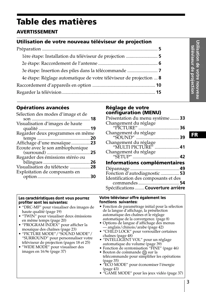 Informations complémentaires Dépannage .......................................... 49 Fonction d’autodiagnostic ................ 53 Identification des composants et des commandes ................................... 54 Spécifications ........ Couverture arrière Votre téléviseur offre également les fonctions suivantes: