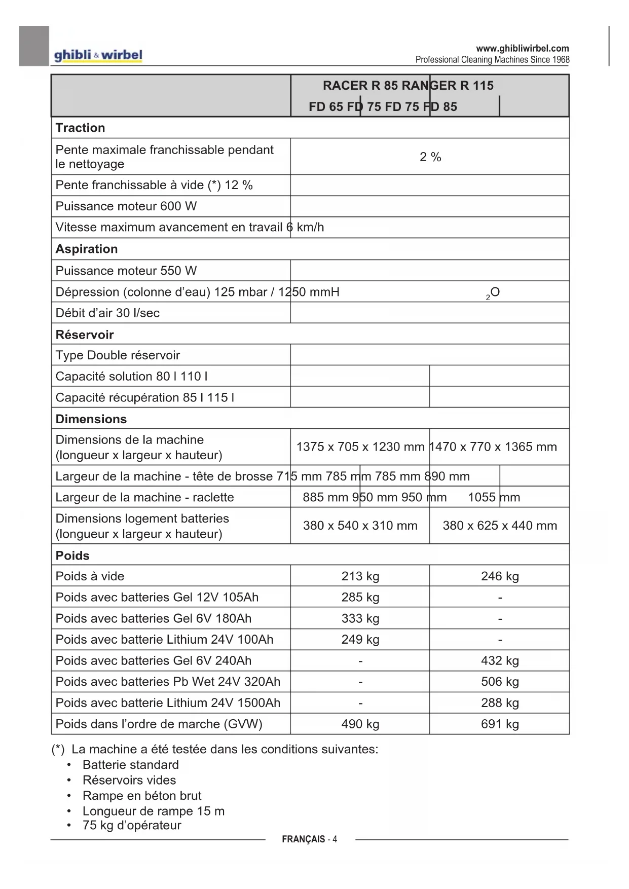 Débit d’air 30 l/sec Réservoir Type Double réservoir Capacité solution 80 l 110 l Capacité récupération 85 l 115 l Dimensions Dimensions de la machine (longueur x largeur x hauteur) 1375 x 705 x 1230 mm 1470 x 770 x 1365 mm Largeur de la machine - tête de brosse 715 mm 785 mm 785 mm 890 mm Largeur de la machine - raclette 885 mm 950 mm 950 mm 1055 mm Dimensions logement batteries (longueur x largeur x hauteur) 380 x 540 x 310 mm 380 x 625 x 440 mm Poids Poids à vide 213 kg 246 kg Poids avec batteries Gel 12V 105Ah 285 kg - Poids avec batteries Gel 6V 180Ah 333 kg - Poids avec batterie Lithium 24V 100Ah 249 kg - Poids avec batteries Gel 6V 240Ah - 432 kg Poids avec batteries Pb Wet 24V 320Ah - 506 kg Poids avec batterie Lithium 24V 1500Ah - 288 kg Poids dans l’ordre de marche (GVW) 490 kg 691 kg (*) La machine a été testée dans les conditions suivantes: