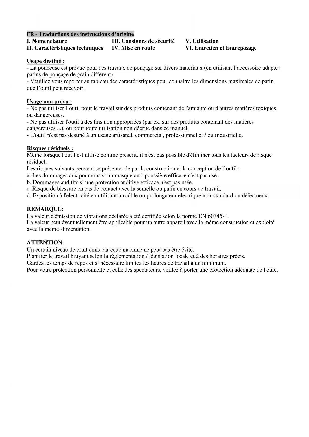 Usage destiné : - La ponceuse est prévue pour des travaux de ponçage sur divers matériaux (en utilisant l’accessoire adapté : patins de ponçage de grain différent). - Veuillez vous reporter au tableau des caractéristiques pour connaitre les dimensions maximales de patin que l’outil peut recevoir. Usage non prévu : - Ne pas utiliser l’outil pour le travail sur des produits contenant de l'amiante ou d'autres matières toxiques ou dangereuses. - Ne pas utiliser l'outil à des fins non appropriées (par ex. sur des produits contenant des matières dangereuses ...), ou pour toute utilisation non décrite dans ce manuel. - L'outil n'est pas destiné à un usage artisanal, commercial, professionnel et / ou industrielle. Risques résiduels : Même lorsque l'outil est utilisé comme prescrit, il n'est pas possible d'éliminer tous les facteurs de risque résiduel. Les risques suivants peuvent se présenter de par la construction et la conception de l’outil : a. Les dommages aux poumons si un masque anti-poussière efficace n'est pas usé. b. Dommages auditifs si une protection auditive efficace n'est pas usée. c. Risque de blessure en cas de contact avec la semelle ou patin en cours de travail. d. Exposition à l'électricité en utilisant un câble ou prolongateur électrique non-standard ou défectueux. REMARQUE: La valeur d'émission de vibrations déclarée a été certifiée selon la norme EN 60745-1. La valeur peut éventuellement être applicable pour un autre appareil avec la même construction et exploité avec la même alimentation. ATTENTION: Un certain niveau de bruit émis par cette machine ne peut pas être évité. Planifier le travail bruyant selon la règlementation / législation locale et à des horaires précis. Gardez les temps de repos et si nécessaire limitez les heures de travail à un minimum. Pour votre protection personnelle et celle des spectateurs, veillez à porter une protection adéquate de l'ouïe.I. NOMENCLATURE Voir Fig. 1