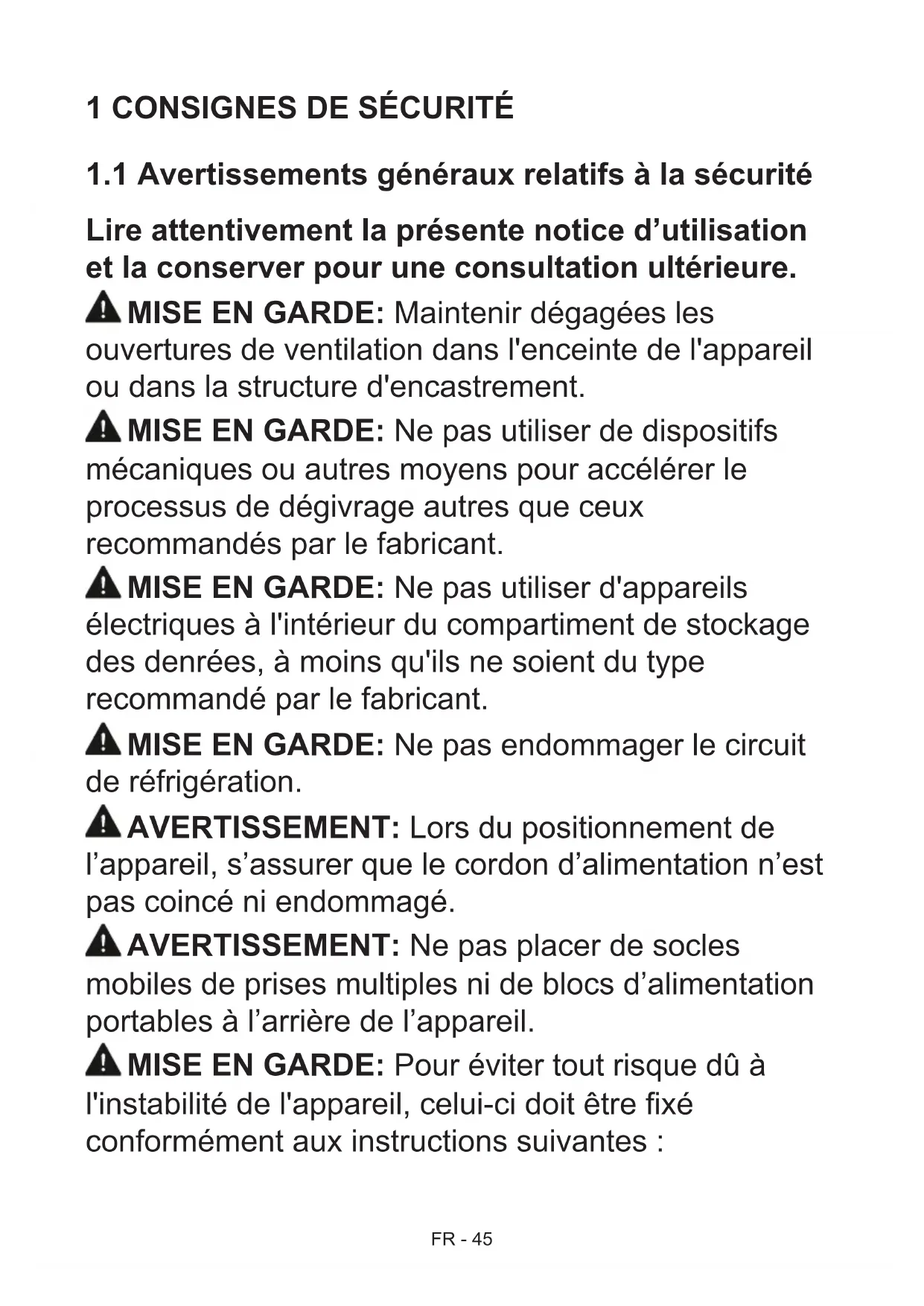Lire attentivement la présente notice d’utilisation et la conserver pour une consultation ultérieure. MISE EN GARDE: Maintenir dégagées les ouvertures de ventilation dans l'enceinte de l'appareil ou dans la structure d'encastrement. MISE EN GARDE: Ne pas utiliser de dispositifs mécaniques ou autres moyens pour accélérer le processus de dégivrage autres que ceux recommandés par le fabricant. MISE EN GARDE: Ne pas utiliser d'appareils électriques à l'intérieur du compartiment de stockage des denrées, à moins qu'ils ne soient du type recommandé par le fabricant. MISE EN GARDE: Ne pas endommager le circuit de réfrigération.