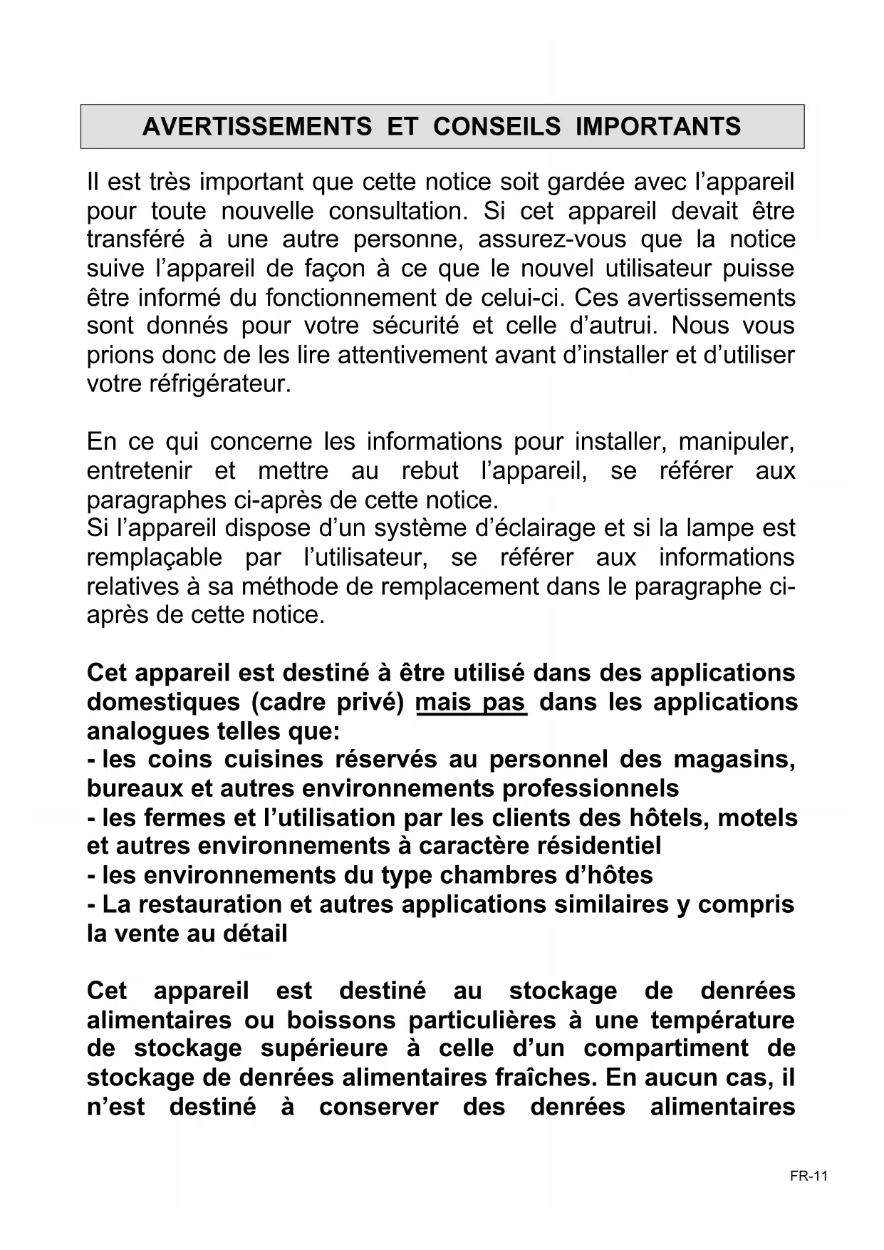 Il est très important que cette notice soit gardée avec l’appareil pour toute nouvelle consultation. Si cet appareil devait être transféré à une autre personne, assurez-vous que la notice suive l’appareil de façon à ce que le nouvel utilisateur puisse être informé du fonctionnement de celui-ci. Ces avertissements sont donnés pour votre sécurité et celle d’autrui. Nous vous prions donc de les lire attentivement avant d’installer et d’utiliser votre réfrigérateur. En ce qui concerne les informations pour installer, manipuler, entretenir et mettre au rebut l’appareil, se référer aux paragraphes ci-après de cette notice. Si l’appareil dispose d’un système d’éclairage et si la lampe est remplaçable par l’utilisateur, se référer aux informations relatives à sa méthode de remplacement dans le paragraphe ci- après de cette notice. Cet appareil est destiné à être utilisé dans des applications domestiques (cadre privé) mais pas dans les applications analogues telles que: - les coins cuisines réservés au personnel des magasins, bureaux et autres environnements professionnels - les fermes et l’utilisation par les clients des hôtels, motels et autres environnements à caractère résidentiel - les environnements du type chambres d’hôtes - La restauration et autres applications similaires y compris la vente au détail Cet appareil est destiné au stockage de denrées alimentaires ou boissons particulières à une température de stockage supérieure à celle d’un compartiment de stockage de denrées alimentaires fraîches. En aucun cas, il n’est destiné à conserver des denrées alimentairesFR-12 fraîches. Ne l’utilisez pas à des fins commerciales ou industrielles ou pour d’autre but que celui pour lequel il a été conçu. Sécurité