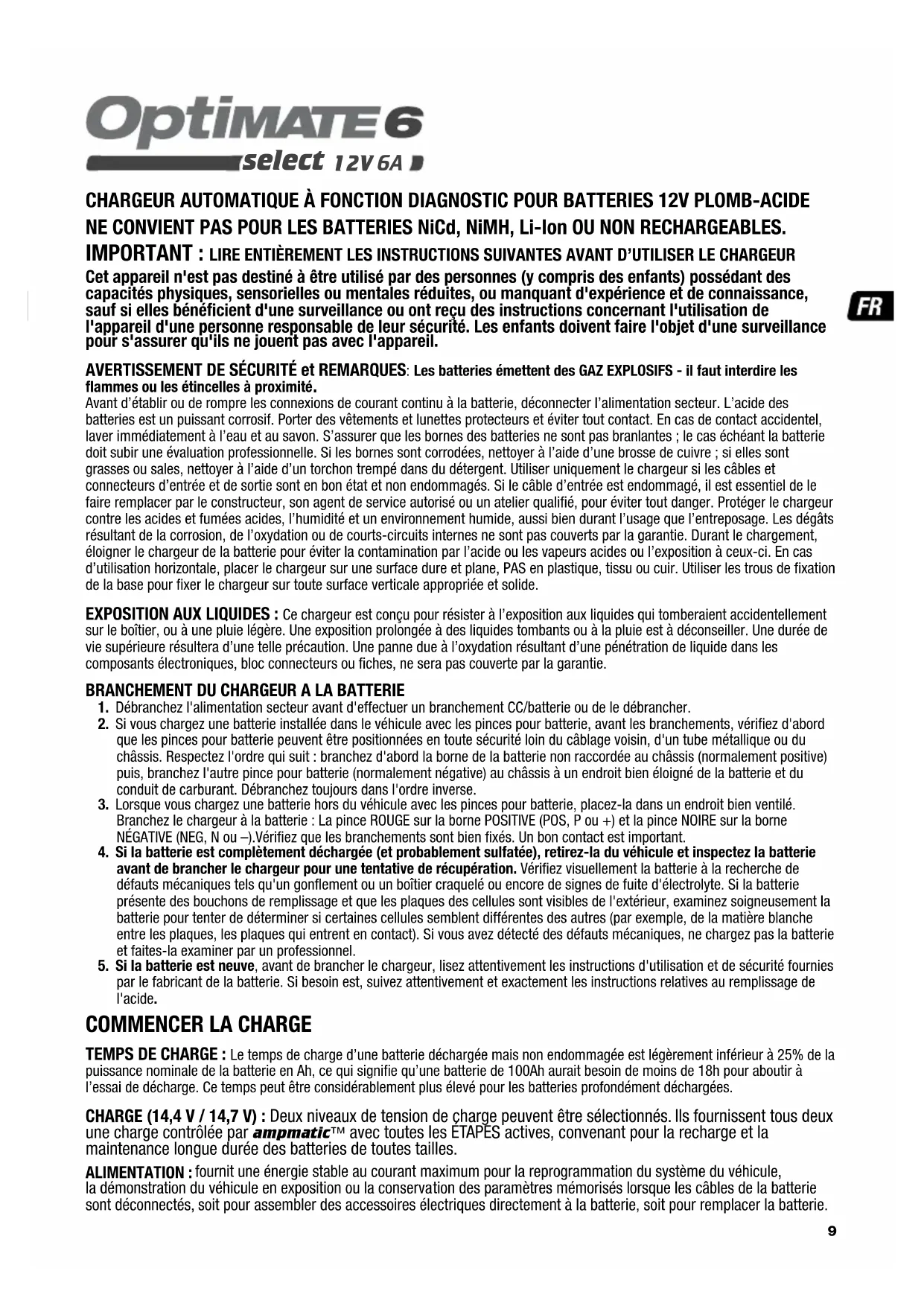 select CHARGEUR AUTOMATIQUE À FONCTION DIAGNOSTIC POUR BATTERIES 12V PLOMB-ACIDE NE CONVIENT PAS POUR LES BATTERIES NiCd, NiMH, Li-Ion OU NON RECHARGEABLES. IMPORTANT : LIRE ENTIÈREMENT LES INSTRUCTIONS SUIVANTES AVANT D’UTILISER LE CHARGEUR Cet appareil n'est pas destiné à être utilisé par des personnes (y compris des enfants) possédant des capacités physiques, sensorielles ou mentales réduites, ou manquant d'expérience et de connaissance, sauf si elles bénéficient d'une surveillance ou ont reçu des instructions concernant l'utilisation de l'appareil d'une personne responsable de leur sécurité. Les enfants doivent faire l'objet d'une surveillance pour s'assurer qu'ils ne jouent pas avec l'appareil. AVERTISSEMENT DE SÉCURITÉ et REMARQUES : Les batteries émettent des GAZ EXPLOSIFS - il faut interdire les flammes ou les étincelles à proximité
