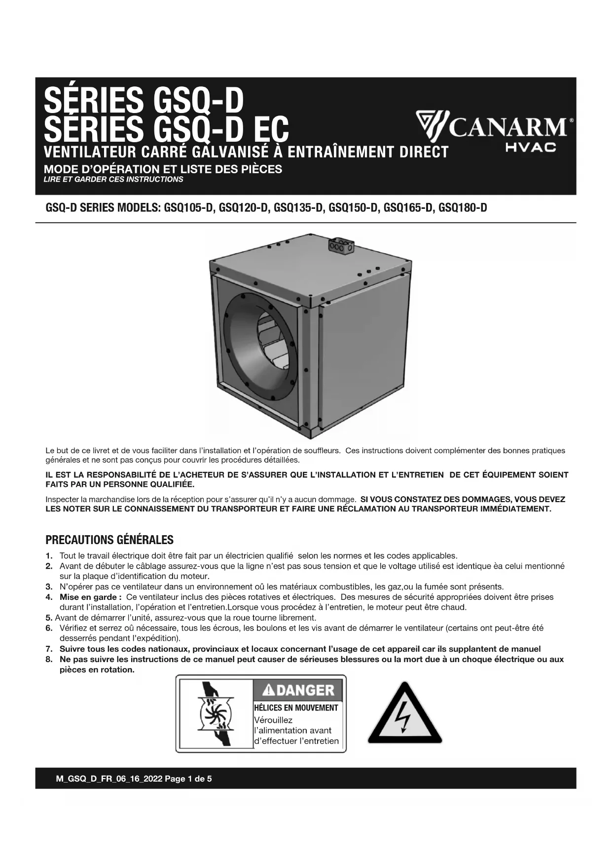 6. Vérifiez et serrez oû nécessaire, tous les écrous, les boulons et les vis avant de démarrer le ventilateur (certains ont peut-être été desserrés pendant l'expédition). 7. Suivre tous les codes nationaux, provinciaux et locaux concernant l’usage de cet appareil car ils supplantent de manuel 8. Ne pas suivre les instructions de ce manuel peut causer de sérieuses blessures ou la mort due à un choque électrique ou aux pièces en rotation. Le but de ce livret et de vous faciliter dans l’installation et l’opération de souffleurs. Ces instructions doivent complémenter des bonnes pratiques générales et ne sont pas conçus pour couvrir les procédures détaillées. IL EST LA RESPONSABILITÉ DE L’ACHETEUR DE S’ASSURER QUE L’INSTALLATION ET L’ENTRETIEN DE CET ÉQUIPEMENT SOIENT FAITS PAR UN PERSONNE QUALIFIÉE. Inspecter la marchandise lors de la réception pour s’assurer qu’il n’y a aucun dommage. SI VOUS CONSTATEZ DES DOMMAGES, VOUS DEVEZ LES NOTER SUR LE CONNAISSEMENT DU TRANSPORTEUR ET FAIRE UNE RÉCLAMATION AU TRANSPORTEUR IMMÉDIATEMENT. HÉLICES EN MOUVEMENT Vérouillez l’alimentation avant d’effectuer l’entretienSÉRIES GSQ-D