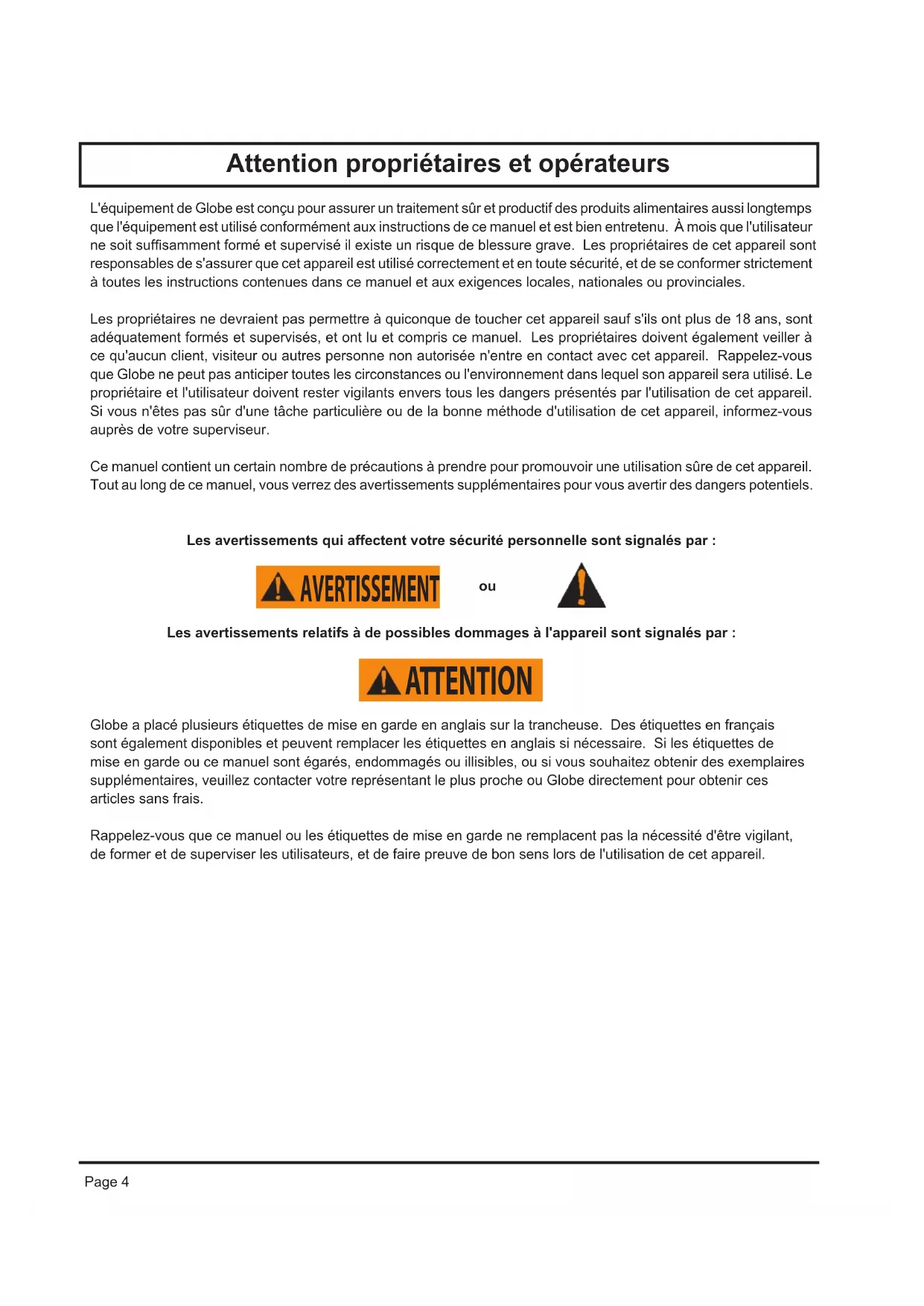 COURRIEL: info@globefoodequip.com SITE WEB : www.globefoodequip.com © Globe Food Equipment Company, 2016 11152016 980169 Ver. 2 Rev. -_2016 Table des matièresPage 4 L'équipement de Globe est conçu pour assurer un traitement sûr et productif des produits alimentaires aussi longtemps que l'équipement est utilisé conformément aux instructions de ce manuel et est bien entretenu. À mois que l'utilisateur ne soit sufsamment formé et supervisé il existe un risque de blessure grave. Les propriétaires de cet appareil sont responsables de s'assurer que cet appareil est utilisé correctement et en toute sécurité, et de se conformer strictement à toutes les instructions contenues dans ce manuel et aux exigences locales, nationales ou provinciales. Les propriétaires ne devraient pas permettre à quiconque de toucher cet appareil sauf s'ils ont plus de 18 ans, sont adéquatement formés et supervisés, et ont lu et compris ce manuel. Les propriétaires doivent également veiller à ce qu'aucun client, visiteur ou autres personne non autorisée n'entre en contact avec cet appareil. Rappelez-vous que Globe ne peut pas anticiper toutes les circonstances ou l'environnement dans lequel son appareil sera utilisé. Le propriétaire et l'utilisateur doivent rester vigilants envers tous les dangers présentés par l'utilisation de cet appareil. Si vous n'êtes pas sûr d'une tâche particulière ou de la bonne méthode d'utilisation de cet appareil, informez-vous auprès de votre superviseur. Ce manuel contient un certain nombre de précautions à prendre pour promouvoir une utilisation sûre de cet appareil. Tout au long de ce manuel, vous verrez des avertissements supplémentaires pour vous avertir des dangers potentiels. Les avertissements qui affectent votre sécurité personnelle sont signalés par : Les avertissements relatifs à de possibles dommages à l'appareil sont signalés par : Globe a placé plusieurs étiquettes de mise en garde en anglais sur la trancheuse. Des étiquettes en français sont également disponibles et peuvent remplacer les étiquettes en anglais si nécessaire. Si les étiquettes de mise en garde ou ce manuel sont égarés, endommagés ou illisibles, ou si vous souhaitez obtenir des exemplaires supplémentaires, veuillez contacter votre représentant le plus proche ou Globe directement pour obtenir ces articles sans frais. Rappelez-vous que ce manuel ou les étiquettes de mise en garde ne remplacent pas la nécessité d'être vigilant, de former et de superviser les utilisateurs, et de faire preuve de bon sens lors de l'utilisation de cet appareil. Attention propriétaires et opérateurs AVERTISSEMENT AT TENTION ouPage 5 Composants principaux du batteur mélangeur