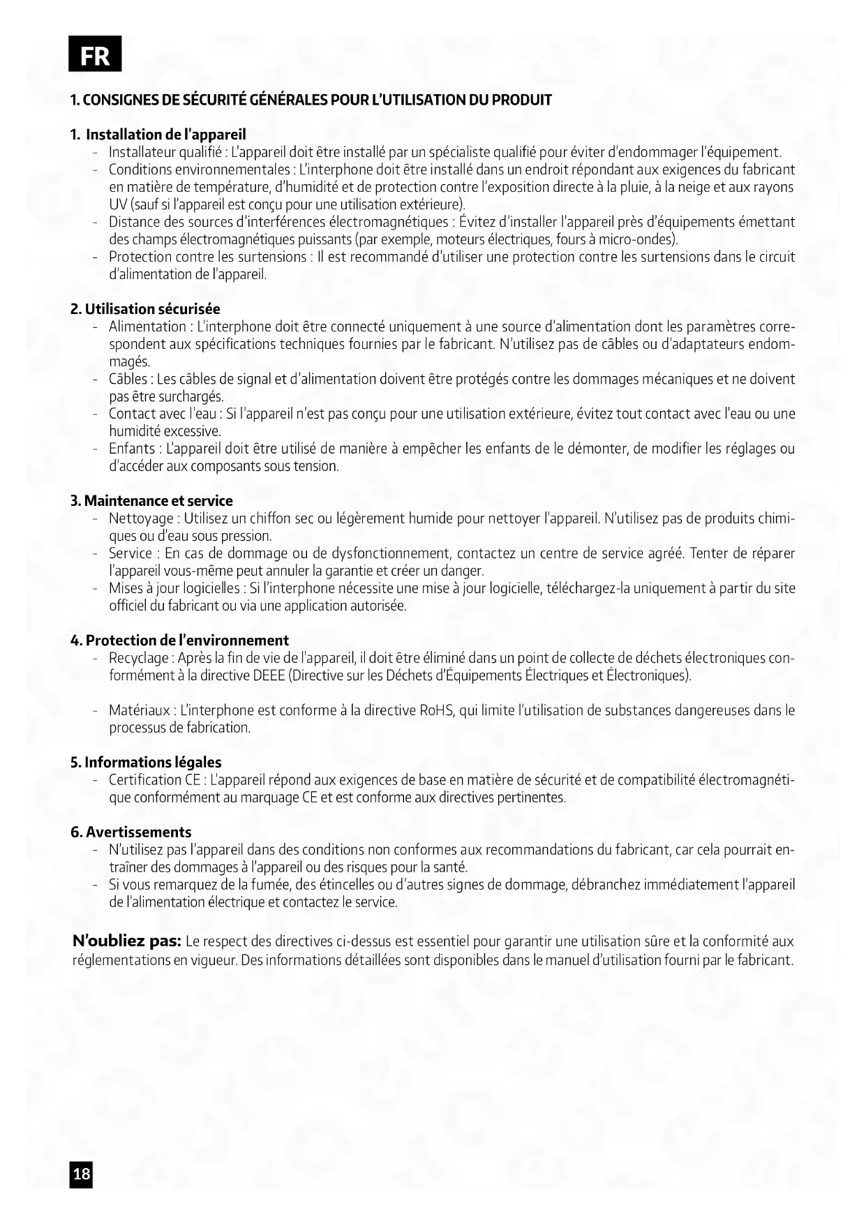 - Recyclage : Après la n de vie de l’appareil, il doit être éliminé dans un point de collecte de déchets électroniques con- formément à la directive DEEE (Directive sur les Déchets d’Équipements Électriques et Électroniques). - Matériaux : L’interphone est conforme à la directive RoHS, qui limite l’utilisation de substances dangereuses dans le processus de fabrication.