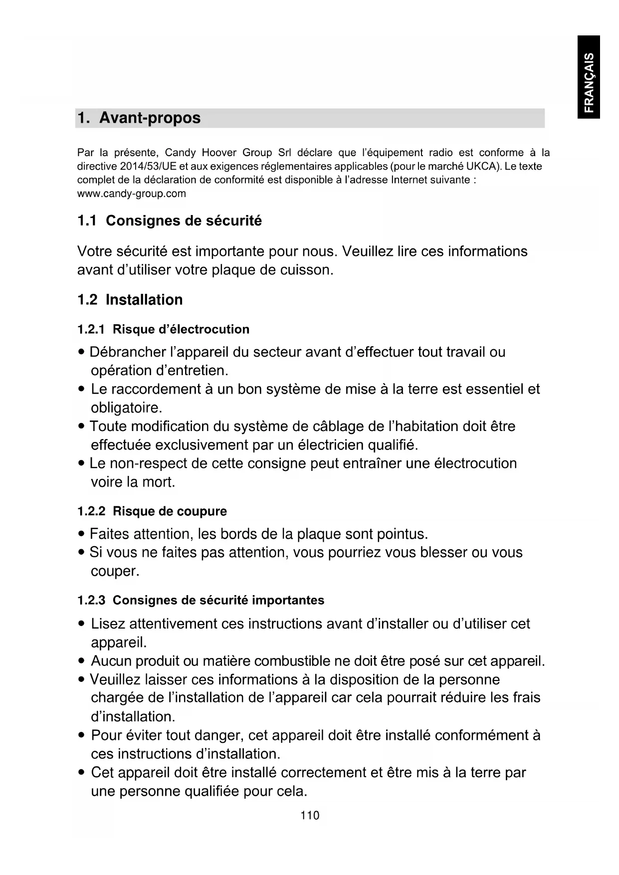 Par la présente, Candy Hoover Group Srl déclare que l’équipement radio est conforme à la directive 2014/53/UE et aux exigences réglementaires applicables (pour le marché UKCA). Le texte complet de la déclaration de conformité est disponible à l’adresse Internet suivante : www.candy-group.com