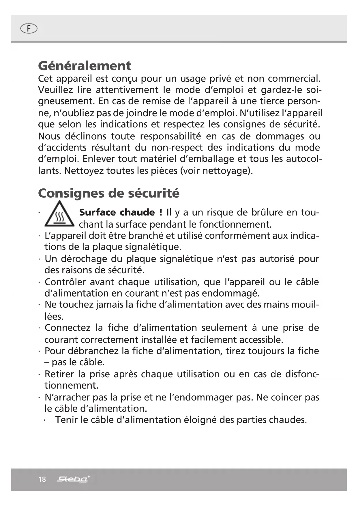 In this instance, the cheese is at the focal point of the raclette party. Plan about 200 to 250 g of cheese and potatoes per person, and side-dishes as well. Place a slice of cheese about 5 mm (3/8th of an inch) thick in the pan, cut to fit, and push it in un- der the grill. Once the cheese has melted into a creamy mass, take the pan out and extract the cheese with the aid of a small wooden spatula and pour it onto boiled or foil potatoes, French bread, or toast.17 Correct Disposal of this product This marking indicates that this product should not be disposed with other household wastes throughout the EU. To prevent possible harm to the envi- ronment or human health from uncontrolled waste disposal, recycle it re- sponsibly to promote the sustainable reuse of material resources. To return your used device, please use the return and collection systems or contact the retailer where the product was purchased. They can take this product for environmental safe recycling. Packaging disposal: Do not throw away the package materials. Please put it in the recycling bin. Gift box: Paper, should be put to the old paper collection point. Plastic packaging material and foils should be collected in the spe- cial collection containers. Service and Repair: If the appliance must be repaired, please get in touch with your trader or with the manufacturer: STEBA Elektrogeräte GmbH & Co KG Pointstr. 2, 96129 Strullendorf / Germany Distribution-Tel.: 09543 / 449-17 / -18, Service-Tel.: 09543 / 449-44, Fax: 09543 / 449-19 e-Mail: elektro@steba.com Internet: http://www.steba.com18 Généralement Cet appareil est conçu pour un usage privé et non commercial. Veuillez lire attentivement le mode d‘emploi et gardez-le soi- gneusement. En cas de remise de l‘appareil à une tierce person- ne, n’oubliez pas de joindre le mode d’emploi. N’utilisez l‘appareil que selon les indications et respectez les consignes de sécurité. Nous déclinons toute responsabilité en cas de dommages ou d’accidents résultant du non-respect des indications du mode d’emploi. Enlever tout matériel d’emballage et tous les autocol- lants. Nettoyez toutes les pièces (voir nettoyage). Consignes de sécurité ∙ Surface chaude ! Il y a un risque de brûlure en tou- chant la surface pendant le fonctionnement. ∙ L‘appareil doit être branché et utilisé conformément aux indica- tions de la plaque signalétique. ∙ Un dérochage du plaque signalétique n‘est pas autorisé pour des raisons de sécurité. ∙ Contrôler avant chaque utilisation, que l’appareil ou le câble d’alimentation en courant n’est pas endommagé. ∙ Ne touchez jamais la fiche d’alimentation avec des mains mouil- lées. ∙ Connectez la fiche d’alimentation seulement à une prise de courant correctement installée et facilement accessible. ∙ Pour débranchez la fiche d’alimentation, tirez toujours la fiche – pas le câble. ∙ Retirer la prise après chaque utilisation ou en cas de disfonc- tionnement. ∙ N’arracher pas la prise et ne l’endommager pas. Ne coincer pas le câble d’alimentation. ∙ Tenir le câble d’alimentation éloigné des parties chaudes.19 ∙ L‘appareil peut être utilisé par des enfants à partir de 8 ans ainsi que par des personnes atteintes de déficiences phy- siques, sensorielles ou mentales, ou manquant d‘expérience et/ ou de connaissances, si elles sont surveillées ou ont été instruites de la manière d‘utiliser l‘appareil en toute sécurité et qu‘elles en ont compris les dangers potentiels. Le nettoyage et l‘entretien de l‘appareil ne doivent pas être réalisés par des enfants, sauf s‘ils sont âgés de plus de 8 ans et exécutent ces opérations sous surveillance. ∙ Tenir l‘appareil et le cordon d‘alimentation hors de portée des enfants de moins de 8 ans. ∙ Veillez á ce que des enfants ne jouent pas avec l’emballage (par exemple sac en plastique). ∙ L´appareil ne doit pas fonctionner avec une minuterie ou avec un système séparé de télécommande ! ∙ Ne laissez jamais l‘appareil sans surveillance lors de son fonc- tionnement. ∙ N‘entreposez pas l‘appareil à l‘extérieur ou dans une pièce hu- mide. ∙ Ne mettez jamais l‘appareil dans l‘eau. ∙ N‘utilisez jamais l‘appareil après un fonctionnement défaillant, par ex. s’il est tombé ou s’il a été endommagé d‘une autre ma- nière. ∙ Le fabricant ne sera pas tenu responsable en cas de mauvaise utilisation ou d‘utilisation inappropriée par non-respect du mode d‘emploi. ∙ Pour éviter tout danger, les réparations sur l‘appareil, notam- ment le remplacement d‘un câble endommagé, ne peuvent être réalisées que par un service après-vente autorisé. Seule- ment les pièces détachées original peuvent être utiliser. ∙ L‘appareil chauffe beaucoup, ne le transporte donc qu‘après re- froidissement. ∙ N‘utilisez l‘appareil que pour les applications décrites dans le mode d‘emploi.20 ∙ Ne placez aucun des matériaux que le papier, carton, plastique etc. dans l’appareil. ∙ Cet appareil est conçu pour un usage privé et similaires telles que : o dans les cuisines pour les employés dans les magasins, bu- reaux et autres zones industrielles o dans les propriétés agricoles et par les clients des hôtels, motels et autres établissements résidentiels o dans chambres d’hôtes ∙ Avant la première utilisation : toutes les pièces – en dehors des résistances – doivent être nettoyées et séchées minutieuse- ment. Pour éliminer l‘odeur du neuf, faites chauffer l‘appareil pendant environ 15 minutes.