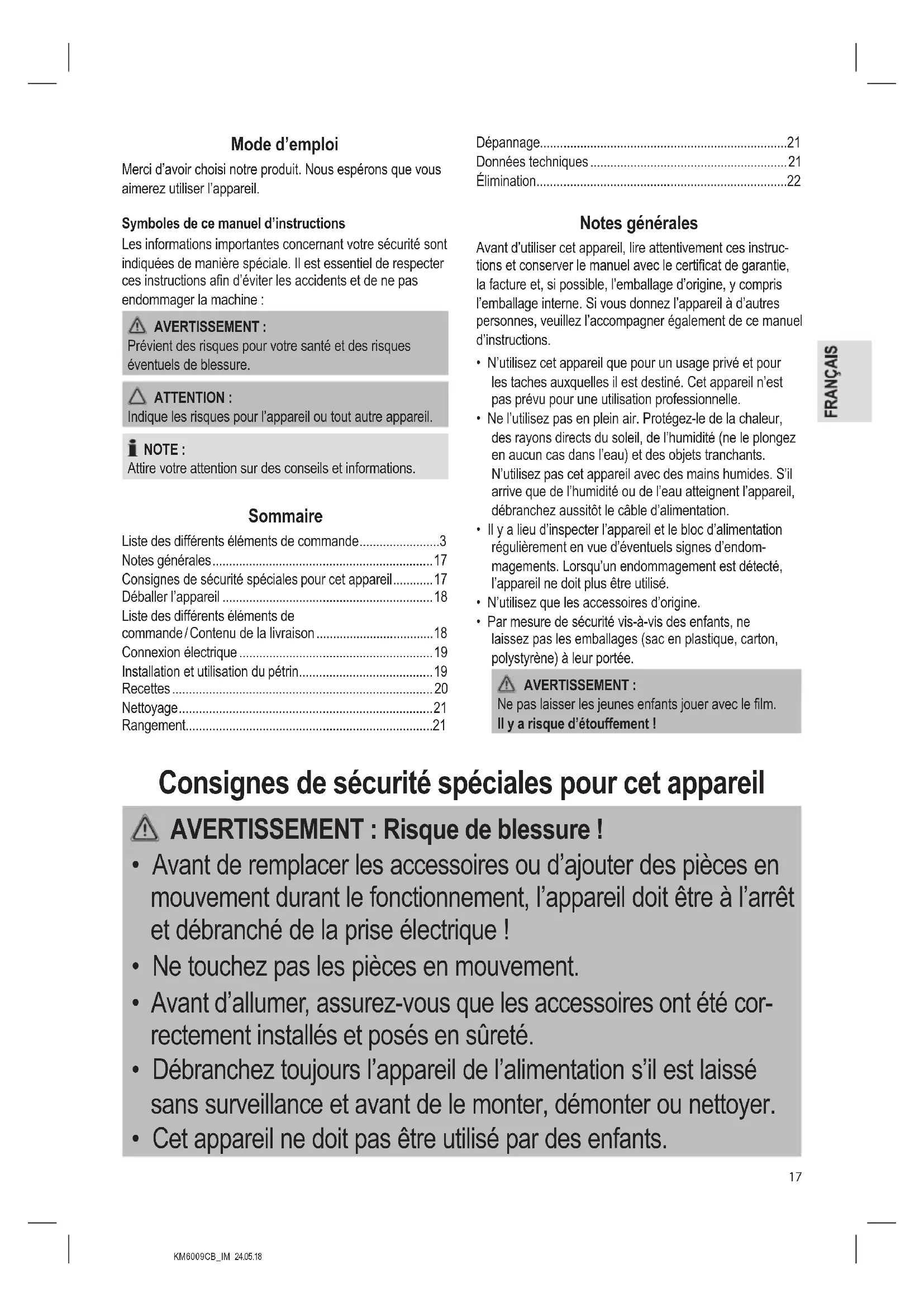 - Gardez toujours l’appareil hors de la portée des enfants dans un endroit sec et bien ventilé. Dépannage Problème Cause possible Solution L’appareil ne s’allume pas ou arrête de fonctionner. L’appareil n’est pas branché. Vériez la prise avec un autre appareil. Branchez correc- tement le cordon d’alimentation. Vériez le fusible. Le bras pivotant n’est pas bloqué dans sa position la plus basse. Un interrupteur de sécurité empêche le fonctionnement. Abaissez simultané- ment la manette et le bras pivotant jusqu’à ce qu’il se bloque. L’appareil est défectueux. Contactez notre centre de service ou un spécialiste. Données techniques Modèle : .............................................................KM 6009 CB Alimentation : ...........................................220 - 240 V~, 50 Hz Puissance électrique : ................................................. 1000 W Classe de protection : .......................................................... Poids net : ............................................................env. 3,50 kg Nous nous réservons le droit d’apporter des modications techniques ainsi que des modications de conception dans le cadre du développement continu de nos produits.KM6009CB_IM 24.05.18