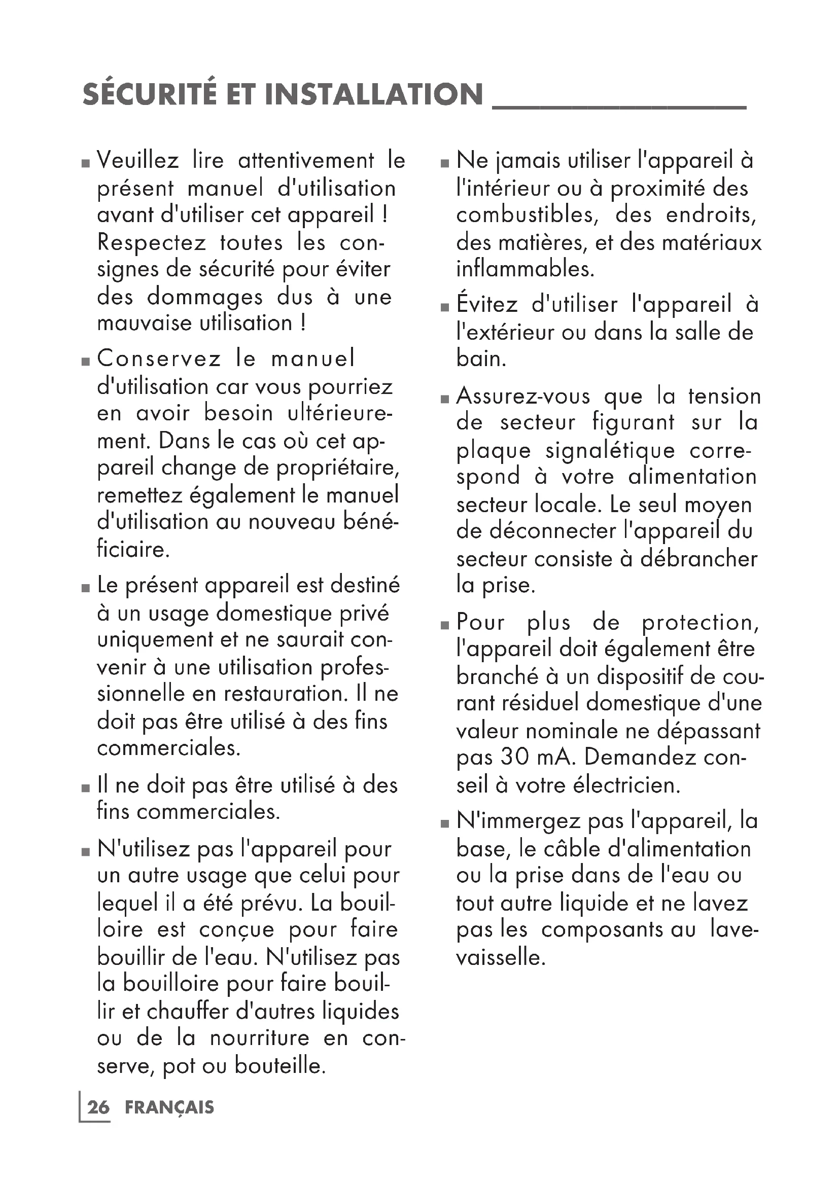 Le présent appareil est destiné à un usage domestique privé uniquement et ne saurait con- venir à une utilisation profes- sionnelle en restauration. Il ne doit pas être utilisé à des fins commerciales.