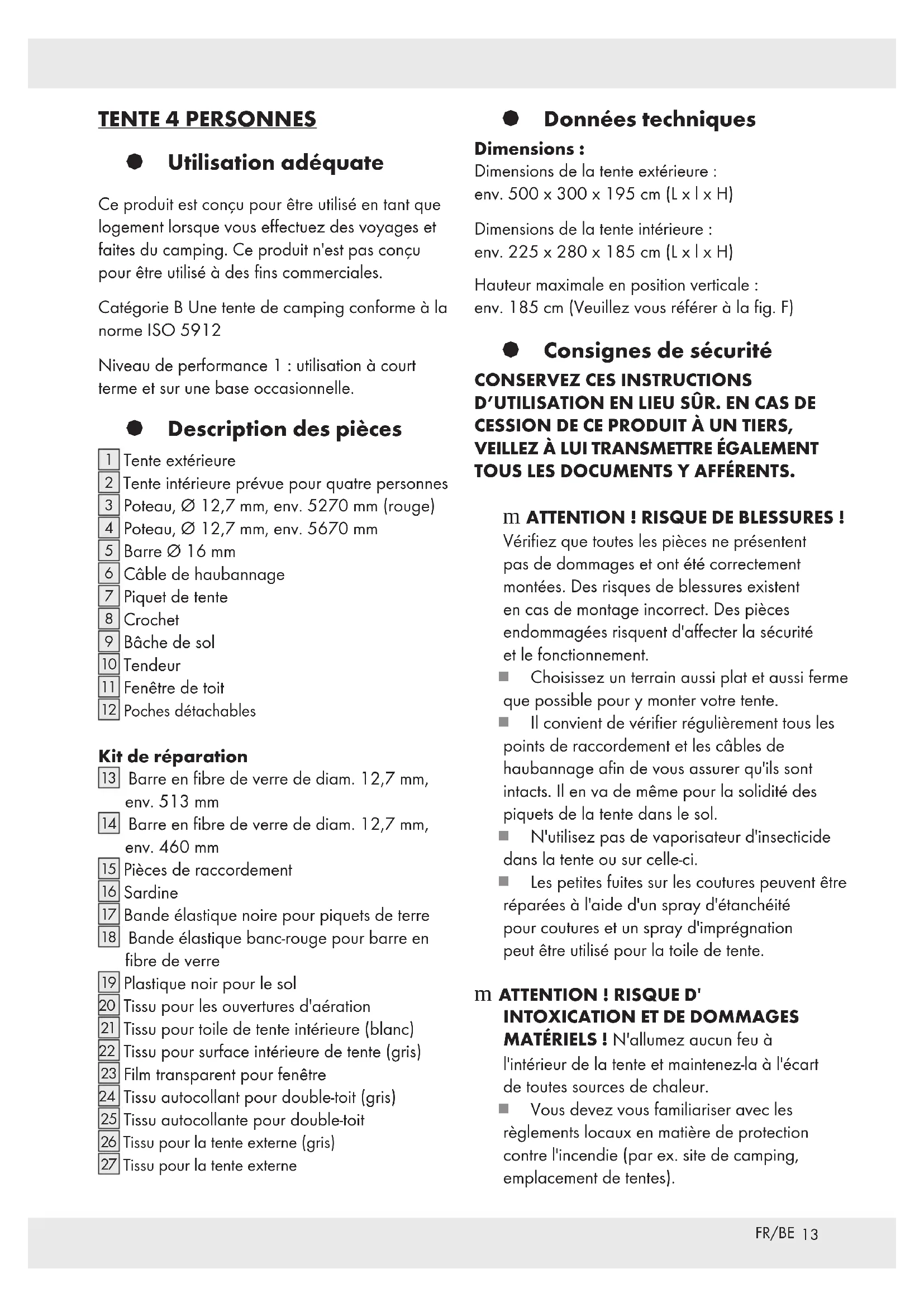 TOUS LES DOCUMENTS Y AFFÉRENTS. m ATTENTION! RISQUE DE BLESSURES! Vérifiez que toutes les pièces ne présentent pas de dommages et ont été correctement montées. Des risques de blessures existent en cas de montage incorrect. Des pièces endommagées risquent d'affecter la sécurité et le fonctionnement. Choisissez un terrain aussi plat et aussi ferme que possible pour y monter votre tente. Il convient de vérifier régulièrement tous les points de raccordement et les câbles de haubannage afin de vous assurer qu'ils sont intacts. Il en va de même pour la solidité des piquets de la tente dans le sol. N'utilisez pas de vaporisateur d'insecticide dans la tente ou sur celle-ci. Les petites fuites sur les coutures peuvent être réparées à l'aide d'un spray d'étanchéité pour coutures et un spray d'imprégnation peut être utilisé pour la toile de tente. m ATTENTION! RISQUE D'