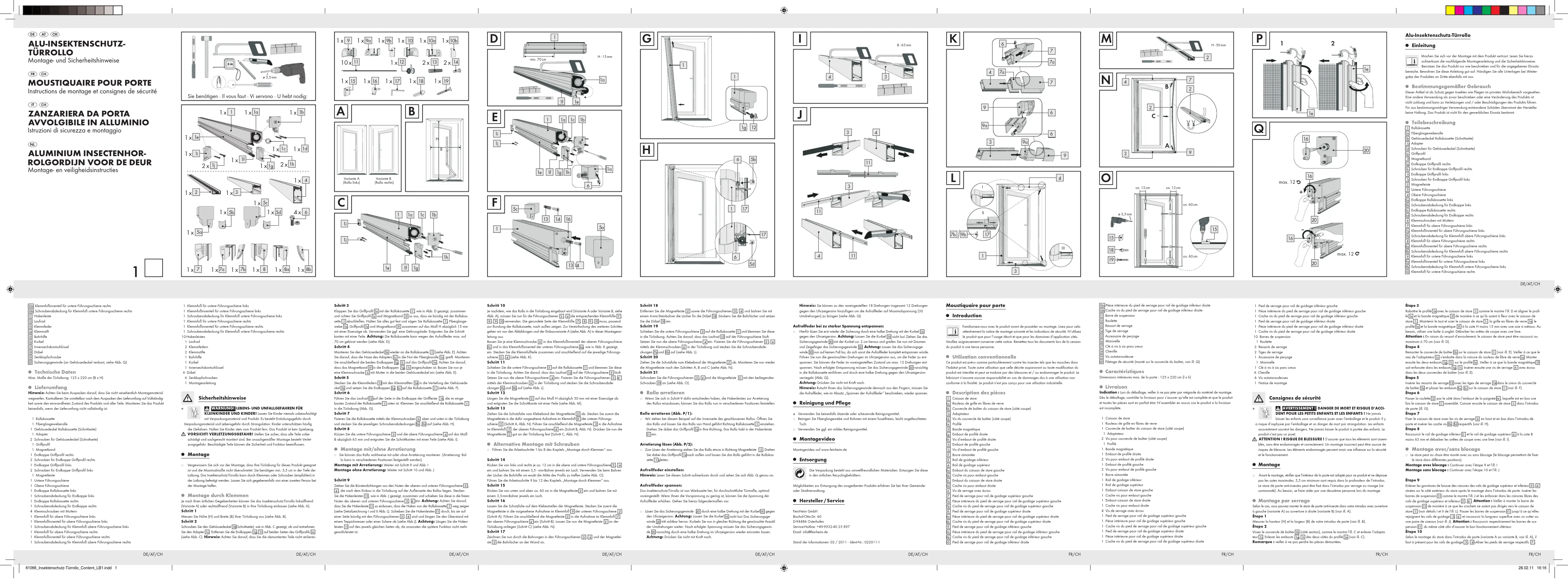 des deux côtés du profilé (voir ill. C). Remarque : veiller à ne pas perdre les pièces démontées.Moustiquaire pour porte Introduction Familiarisez-vous avec le produit avant de procéder au montage. Lisez pour cela attentivement la notice de montage suivante et les indications de sécurité. N‘utilisez le produit que pour l‘usage décrit et que pour les domaines d‘application cités.Veuillez soigneusement conserver cette notice. Remettez tous les documents lors de la cession du produit à une tierce personne. Utilisation conventionnelleCe produit est prévu comme particulièrement contre les insectes tels que les mouches dans l’habitat privé. Toute autre utilisation que celle décrite auparavant ou toute modification du produit est interdite et peut se traduire par des blessures et / ou endommager le produit. Le fabricant n’assume aucune responsabilité en cas de dommages dus à une utilisation non conforme à la finalité. Le produit n’est pas conçu pour une utilisation industrielle. Description des pièces Caisson de store Rouleau de grille en fibres de verre Couvercle de boîtier du caisson de store (côté coupe) Adaptateur Vis du couvercle de boîtier (côté coupe) Profilé Bande magnétique Embout de profilé droite Vis d‘embout de profilé droite Embout de profilé gauche Vis d‘embout de profilé gauche Barre aimantée Rail de guidage inférieur Rail de guidage supérieur 5 a Embout du caisson de store gauche 5 b Cache vis pour embout gauche 5 c Embout du caisson de store droite 5 d Cache vis pour embout droite Vis de serrage avec écrou Pied de serrage pour rail de guidage supérieur gauche 7 a Pièce intérieure du pied de serrage pour rail de guidage supérieur gauche 7 b Cache vis du pied de serrage pour rail de guidage supérieur gauche Pied de serrage pour rail de guidage supérieur droite 8 a Pièce intérieure du pied de serrage pour rail de guidage supérieur droite 8 b Cache vis du pied de serrage pour rail de guidage supérieur droite Pied de serrage pour rail de guidage inférieur gauche 9 a Pièce intérieure du pied de serrage pour rail de guidage inférieur gauche 9 b Cache vis du pied de serrage pour rail de guidage inférieur gauche Pied de serrage pour rail de guidage inférieur droite Hinweis: Sie können zu den voreingestellten 18 Drehungen insgesamt 12 Drehungen gegen den Uhrzeigersinn hinzufügen um die Aufrollfeder auf Maximalspannung (30 Umdrehungen) zu bringen (siehe Abb. Q).Aufrollfeder bei zu starker Spannung entspannen: j Hierfür lösen Sie erst wieder die Sicherung durch eine halbe Drehung mit der Kurbel