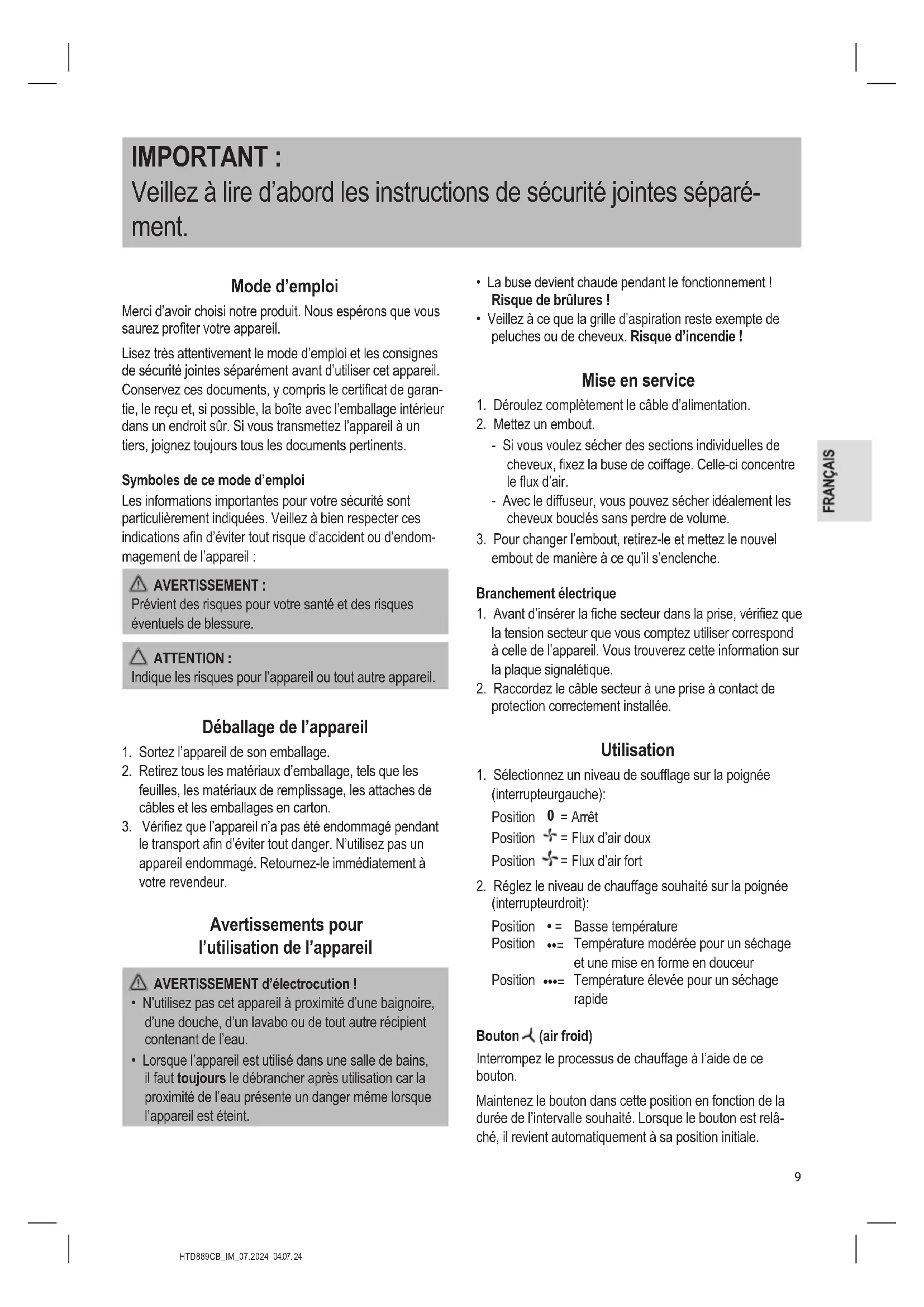 d’une montre et serrez-la. Données techniques Modèle : .............................................................HTD 889 CB Alimentation électrique : .....................220 – 240 V~, 50 / 60 Hz Puissance absorbée : ...................................... 1800 – 2000 W Consommation d’énergie en mode arrêt : ..................... 0,1 W Classe de protection : .......................................................... Poids net : ..............................................................env. 0,5 kg Nous nous réservons le droit d’apporter des modications techniques ainsi que des modications de conception dans le cadre du développement continu de nos produits. Cet appareil a été testé conformément à toutes les direc- tives CE applicables et actuelles et a été construit selon les dernières réglementations en matière de sécurité. Élimination Signification du symbole « Poubelle » Protégez votre environnement, ne jetez pas vos appareils électriques avec les ordures ména- gères. Utilisez, pour l’élimination de vos appareils électriques, les bornes de collecte prévues à cet effet où vous pouvez vous débarrasser des appareils que vous n’utilisez plus. Vous contribuez ainsi à éviter les impacts potentiels dans l’environnement et sur la santé de chacun, causés par une mauvaise élimination de ces déchets. Vous contribuez aussi au recyclage sous toutes ses formes des appareils électriques et électroniques usagés.HTD889CB_IM_07.2024 04.07. 24