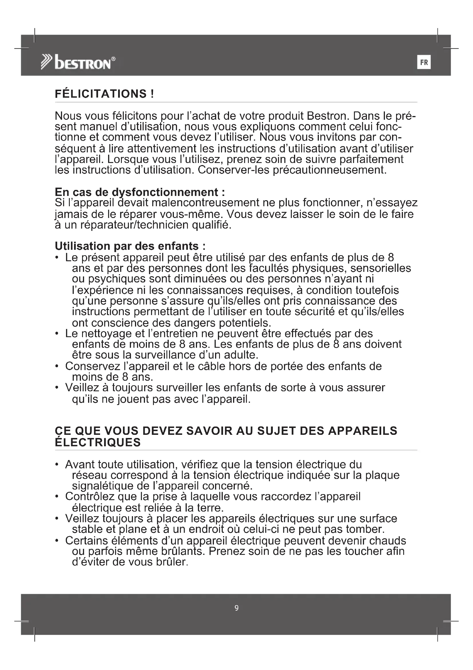 FÉLICITATIONS ! Nous vous félicitons pour l’achat de votre produit Bestron. Dans le pré- sent manuel d’utilisation, nous vous expliquons comment celui fonc- tionne et comment vous devez l’utiliser. Nous vous invitons par con- séquent à lire attentivement les instructions d’utilisation avant d’utiliser l’appareil. Lorsque vous l’utilisez, prenez soin de suivre parfaitement les instructions d’utilisation. Conserver-les précautionneusement. En cas de dysfonctionnement : Si l’appareil devait malencontreusement ne plus fonctionner, n’essayez jamais de le réparer vous-même. Vous devez laisser le soin de le faire à un réparateur/technicien qualifié. Utilisation par des enfants :