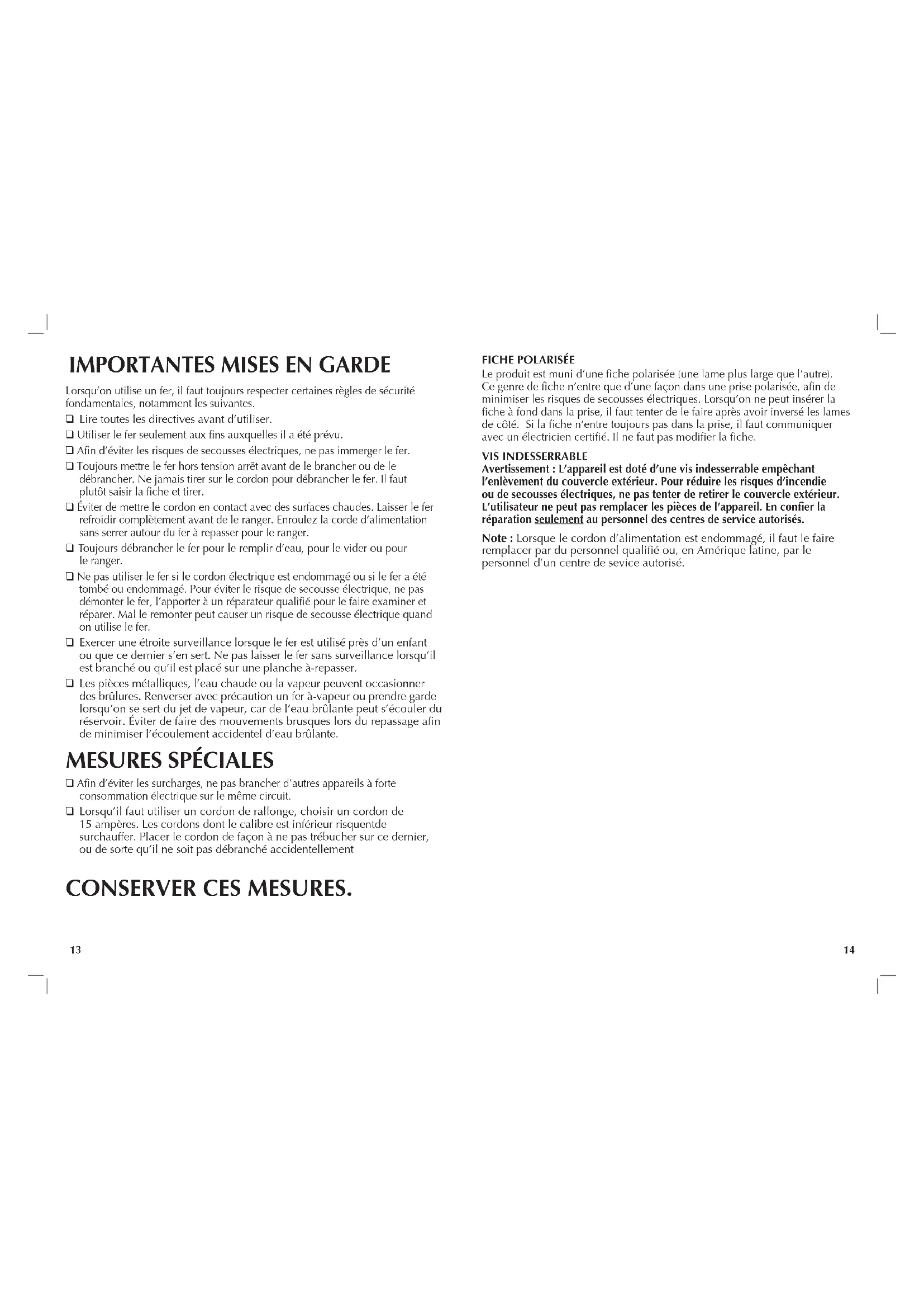 Lire toutes les directives avant d’utiliser. ❑ Utiliser le fer seulement aux fins auxquelles il a été prévu. ❑ Afin d’éviter les risques de secousses électriques, ne pas immerger le fer. ❑ Toujours mettre le fer hors tension arrêt avant de le brancher ou de le débrancher. Ne jamais tirer sur le cordon pour débrancher le fer. Il faut plutôt saisir la fiche et tirer. ❑ Éviter de mettre le cordon en contact avec des surfaces chaudes. Laisser le fer refroidir complètement avant de le ranger. Enroulez la corde d’alimentation sans serrer autour du fer à repasser pour le ranger. ❑ Toujours débrancher le fer pour le remplir d’eau, pour le vider ou pour le ranger. ❑ Ne pas utiliser le fer si le cordon électrique est endommagé ou si le fer a été tombé ou endommagé. Pour éviter le risque de secousse électrique, ne pas démonter le fer, l’apporter à un réparateur qualifié pour le faire examiner et réparer. Mal le remonter peut causer un risque de secousse électrique quand on utilise le fer.