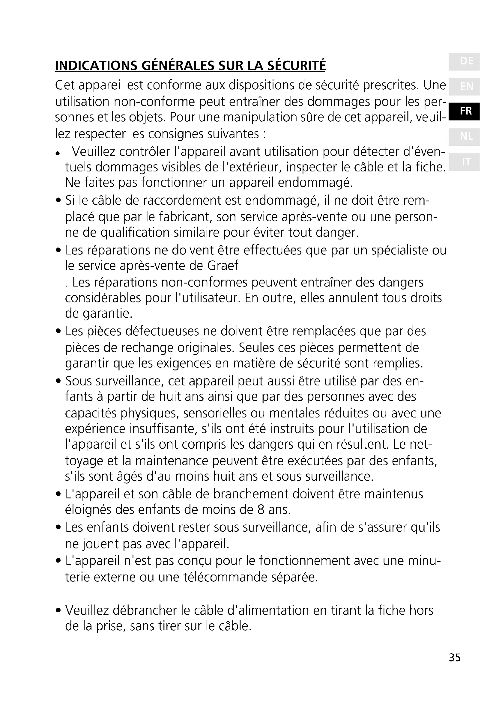 - Les réparations ne doivent être effectuées que par un spécialiste ou le service après-vente de Graef . Les réparations non-conformes peuvent entraîner des dangers considérables pour l'utilisateur. En outre, elles annulent tous droits de garantie.