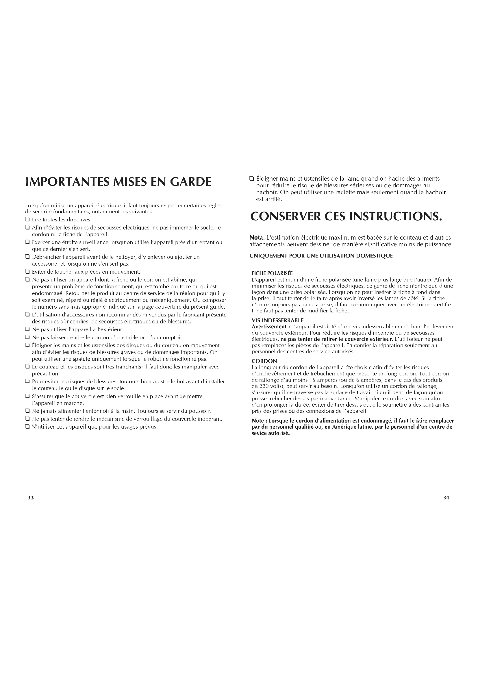 Éloigner les mains et les ustensiles des disques ou du couteau en mouvement afin d’éviter les risques de blessures graves ou de dommages importants. On peut utiliser une spatule uniquement lorsque le robot ne fonctionne pas.