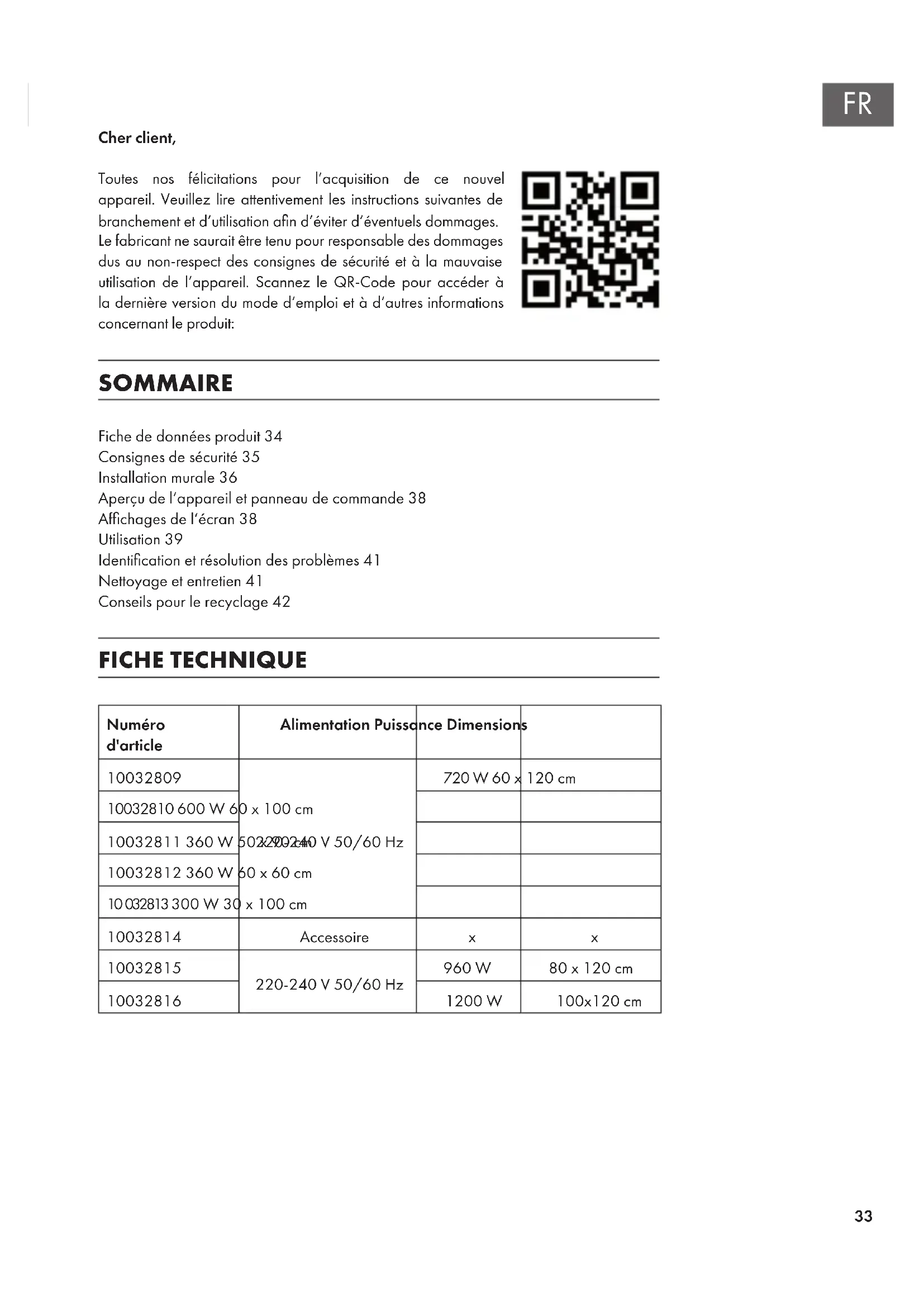 Cher client, Toutes nos félicitations pour l’acquisition de ce nouvel appareil. Veuillez lire attentivement les instructions suivantes de branchement et d’utilisation an d’éviter d’éventuels dommages. Le fabricant ne saurait être tenu pour responsable des dommages dus au non-respect des consignes de sécurité et à la mauvaise utilisation de l’appareil. Scannez le QR-Code pour accéder à la dernière version du mode d‘emploi et à d‘autres informations concernant le produit: SOMMAIRE Fiche de données produit34 Consignes de sécurité35 Installation murale36 Aperçu de l‘appareil et panneau de commande38 Afchages de l‘écran38 Utilisation39 Identication et résolution des problèmes41 Nettoyage et entretien41 Conseils pour le recyclage42 FICHE TECHNIQUE Numéro d'article Alimentation Puissance Dimensions
