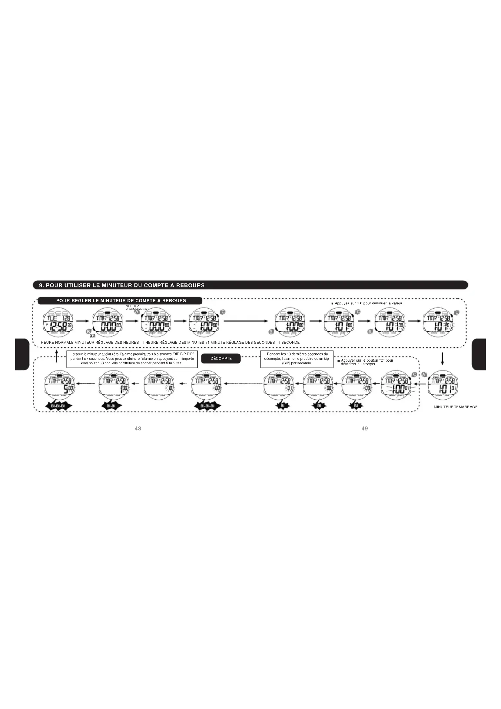 HEURE NORMALE MINUTEUR RÉGLAGE DES HEURES +1 HEURE RÉGLAGE DES MINUTES +1 MINUTE RÉGLAGE DES SECONDES +1 SECONDE MINUTEURDÉMARRAGE Lorsque le minuteur atteint zéro, l’alarme produira trois bip sonores “BIP-BIP-BIP” pendant six secondes. Vous pouvez éteindre l’alarme en appuyant sur n’importe quel bouton. Sinon, elle continuera de sonner pendant 5 minutes. SERREZ 2 SECONDES DÉCOMPTE Appuyer sur le bouton “C” pour démarrer ou stopper. Appuyez sur "D" pour diminuer la valeur Pendant les 10 dernières secondes du décompte, l’alarme ne produire qu’un bip (BIP) par seconde. POUR REGLER LE MINUTEUR DE COMPTE A REBOURS10. COMMENT RÉGLER L’HEURE DANS LE MONDE