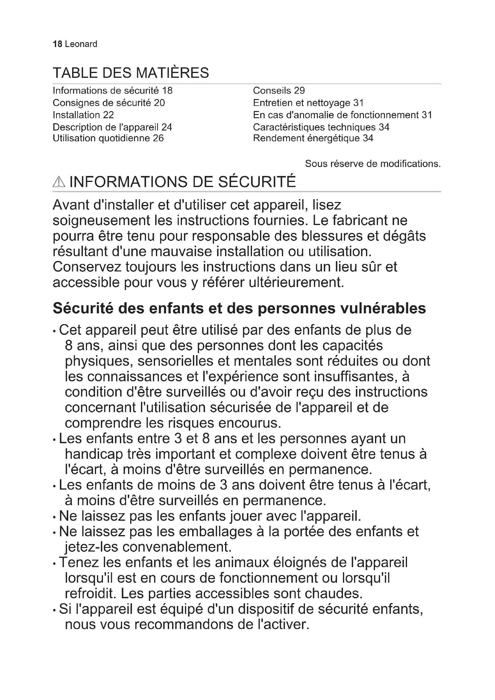 - Si l'appareil est équipé d'un dispositif de sécurité enfants, nous vous recommandons de l'activer. 18 Leonard• Les enfants ne doivent pas nettoyer ni entreprendre une opération de maintenance sur l'appareil sans surveillance. Sécurité générale