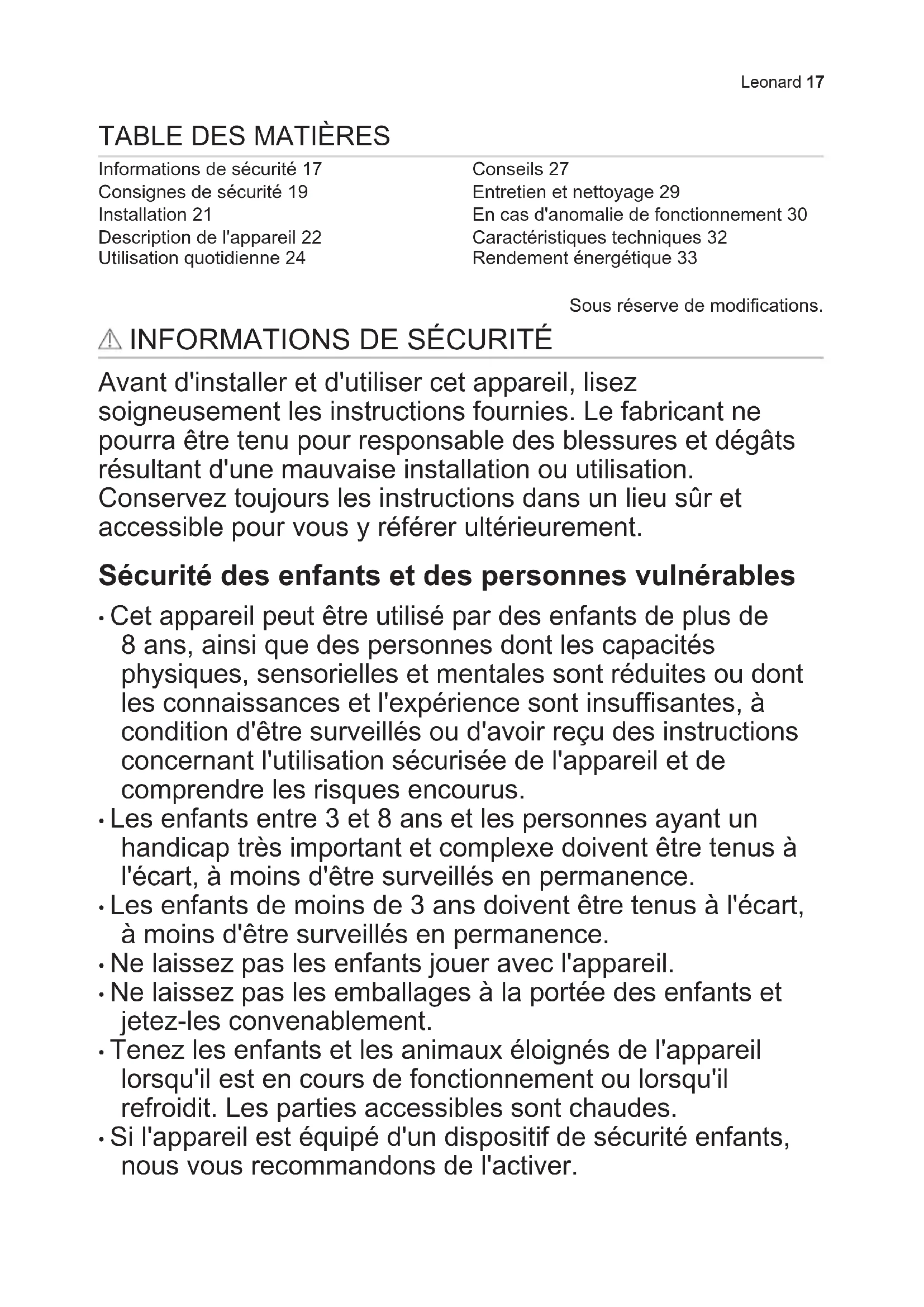 - Si l'appareil est équipé d'un dispositif de sécurité enfants, nous vous recommandons de l'activer. Leonard 17• Les enfants ne doivent pas nettoyer ni entreprendre une opération de maintenance sur l'appareil sans surveillance. Sécurité générale