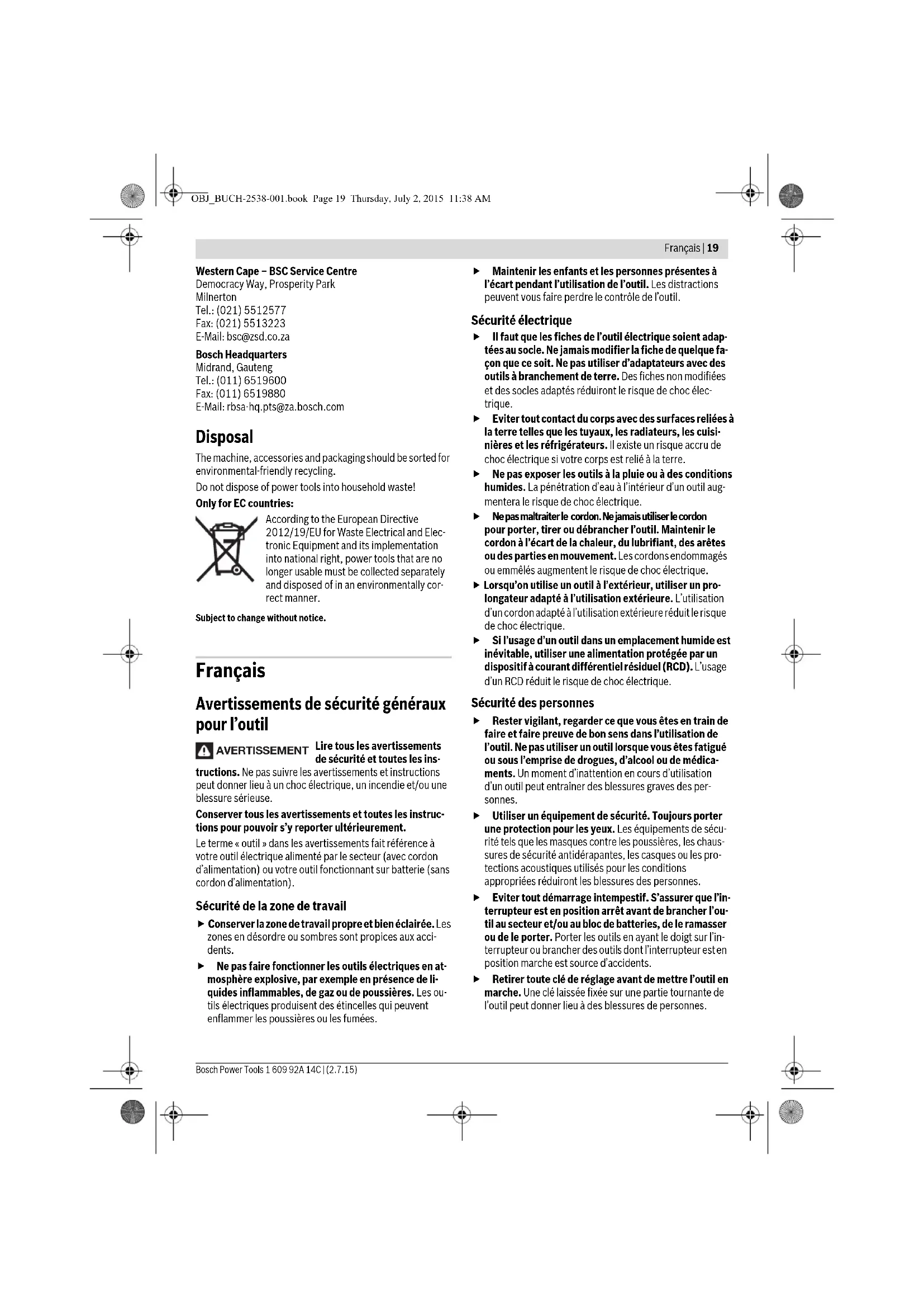 Selecting Accessories – 283 – 285 Action Figure Please observe Page OBJ_BUCH-2538-001.book Page 18 Thursday, July 2, 2015 11:38 AMFrançais | 19 Bosch Power Tools 1 609 92A 14C | (2.7.15) Western Cape – BSC Service Centre Democracy Way, Prosperity Park Milnerton Tel.: (021) 5512577 Fax: (021) 5513223 E-Mail: bsc@zsd.co.za Bosch Headquarters Midrand, Gauteng Tel.: (011) 6519600 Fax: (011) 6519880 E-Mail: rbsa-hq.pts@za.bosch.com Disposal The machine, accessories and packaging should be sorted for environmental-friendly recycling. Do not dispose of power tools into household waste! Only for EC countries: According to the European Directive 2012/19/EU for Waste Electrical and Elec- tronic Equipment and its implementation into national right, power tools that are no longer usable must be collected separately and disposed of in an environmentally cor- rect manner. Subject to change without notice. Français Avertissements de sécurité généraux pour l’outil Lire tous les avertissements de sécurité et toutes les ins- tructions. Ne pas suivre les avertissements et instructions peut donner lieu à un choc électrique, un incendie et/ou une blessure sérieuse. Conserver tous les avertissements et toutes les instruc- tions pour pouvoir s’y reporter ultérieurement. Le terme « outil » dans les avertissements fait référence à votre outil électrique alimenté par le secteur (avec cordon d’alimentation) ou votre outil fonctionnant sur batterie (sans cordon d’alimentation). Sécurité de la zone de travail Conserver la zone de travail propre et bien éclairée. Les zones en désordre ou sombres sont propices aux acci- dents. Ne pas faire fonctionner les outils électriques en at- mosphère explosive, par exemple en présence de li- quides inflammables, de gaz ou de poussières. Les ou- tils électriques produisent des étincelles qui peuvent enflammer les poussières ou les fumées. Maintenir les enfants et les personnes présentes à l’écart pendant l’utilisation de l’outil. Les distractions peuvent vous faire perdre le contrôle de l’outil. Sécurité électrique Il faut que les fiches de l’outil électrique soient adap- tées au socle. Ne jamais modifier la fiche de quelque fa- çon que ce soit. Ne pas utiliser d’adaptateurs avec des outils à branchement de terre. Des fiches non modifiées et des socles adaptés réduiront le risque de choc élec- trique. Eviter tout contact du corps avec des surfaces reliées à la terre telles que les tuyaux, les radiateurs, les cuisi- nières et les réfrigérateurs. Il existe un risque accru de choc électrique si votre corps est relié à la terre. Ne pas exposer les outils à la pluie ou à des conditions humides. La pénétration d’eau à l’intérieur d’un outil aug- mentera le risque de choc électrique. Ne pas maltraiter le cordon. Ne jamais utiliser le cordon pour porter, tirer ou débrancher l’outil. Maintenir le cordon à l’écart de la chaleur, du lubrifiant, des arêtes ou des parties en mouvement. Les cordons endommagés ou emmêlés augmentent le risque de choc électrique. Lorsqu’on utilise un outil à l’extérieur, utiliser un pro- longateur adapté à l’utilisation extérieure. L’utilisation d’un cordon adapté à l’utilisation extérieure réduit le risque de choc électrique. Si l’usage d’un outil dans un emplacement humide est inévitable, utiliser une alimentation protégée par un dispositif à courant différentiel résiduel (RCD). L’usage d’un RCD réduit le risque de choc électrique. Sécurité des personnes Rester vigilant, regarder ce que vous êtes en train de faire et faire preuve de bon sens dans l’utilisation de l’outil. Ne pas utiliser un outil lorsque vous êtes fatigué ou sous l’emprise de drogues, d’alcool ou de médica- ments. Un moment d’inattention en cours d’utilisation d’un outil peut entraîner des blessures graves des per- sonnes. Utiliser un équipement de sécurité. Toujours porter une protection pour les yeux. Les équipements de sécu- rité tels que les masques contre les poussières, les chaus- sures de sécurité antidérapantes, les casques ou les pro- tections acoustiques utilisés pour les conditions appropriées réduiront les blessures des personnes. Eviter tout démarrage intempestif. S’assurer que l’in- terrupteur est en position arrêt avant de brancher l’ou- til au secteur et/ou au bloc de batteries, de le ramasser ou de le porter. Porter les outils en ayant le doigt sur l’in- terrupteur ou brancher des outils dont l’interrupteur est en position marche est source d’accidents. Retirer toute clé de réglage avant de mettre l’outil en marche. Une clé laissée fixée sur une partie tournante de l’outil peut donner lieu à des blessures de personnes. AVERTISSEMENT OBJ_BUCH-2538-001.book Page 19 Thursday, July 2, 2015 11:38 AM20 | Français 1 609 92A 14C | (2.7.15) Bosch Power Tools Ne pas se précipiter. Garder une position et un équi- libre adaptés à tout moment. Cela permet un meilleur contrôle de l’outil dans des situations inattendues. S’habiller de manière adaptée. Ne pas porter de vête- ments amples ou de bijoux. Garder les cheveux, les vê- tements et les gants à distance des parties en mouve- ment. Des vêtements amples, des bijoux ou les cheveux longs peuvent être pris dans des parties en mouvement. Si des dispositifs sont fournis pour le raccordement d’équipements pour l’extraction et la récupération des poussières, s’assurer qu’ils sont connectés et correcte- ment utilisés. Utiliser des collecteurs de poussière peut réduire les risques dus aux poussières. Utilisation et entretien de l’outil Ne pas forcer l’outil. Utiliser l’outil adapté à votre appli- cation. L’outil adapté réalisera mieux le travail et de ma- nière plus sûre au régime pour lequel il a été construit. Ne pas utiliser l’outil si l’interrupteur ne permet pas de passer de l’état de ma