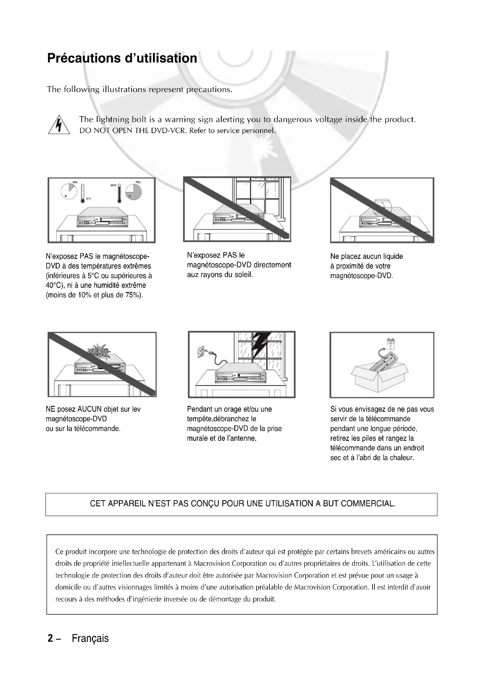 Manuel d’utilisation PAL/NTSC DVD-V6600K DVD-V6600K AFR 1 01/08/2006 10:42 Page 12 - Français Précautions d’utilisation The following illustrations represent precautions. The lightning bolt is a warning sign alerting you to dangerous voltage inside the product. DO NOT OPEN THE DVD-VCR. Refer to service personnel. Ce produit incorpore une technologie de protection des droits d’auteur qui est protégée par certains brevets américains ou autres droits de propriété intellectuelle appartenant à Macrovision Corporation ou d’autres propriétaires de droits. L’utilisation de cette technologie de protection des droits d’auteur doit être autorisée par Macrovision Corporation et est prévue pour un usage à domicile ou d’autres visionnages limités à moins d’une autorisation préalable de Macrovision Corporation. Il est interdit d’avoir recours à des méthodes d’ingénierie inversée ou de démontage du produit. N’exposez PAS le magnétoscope-DVD directement auz rayons du soleil. N’exposez PAS le magnétoscope- DVD à des températures extrêmes (inférieures à 5°C ou supérieures à 40°C), ni à une humidité extrême (moins de 10% et plus de 75%). Ne placez aucun liquide à proximité de votre magnétoscope-DVD. NE posez AUCUN objet sur lev magnétoscope-DVD ou sur la télécommande. Pendant un orage et/ou une tempête,débranchez le magnétoscope-DVD de la prise murale et de l’antenne. Si vous envisagez de ne pas vous servir de la télécommande pendant une longue période, retirez les piles et rangez la télécommande dans un endroit sec et à l’abri de la chaleur. CET APPAREIL N’EST PAS CONÇU POUR UNE UTILISATION A BUT COMMERCIAL.
