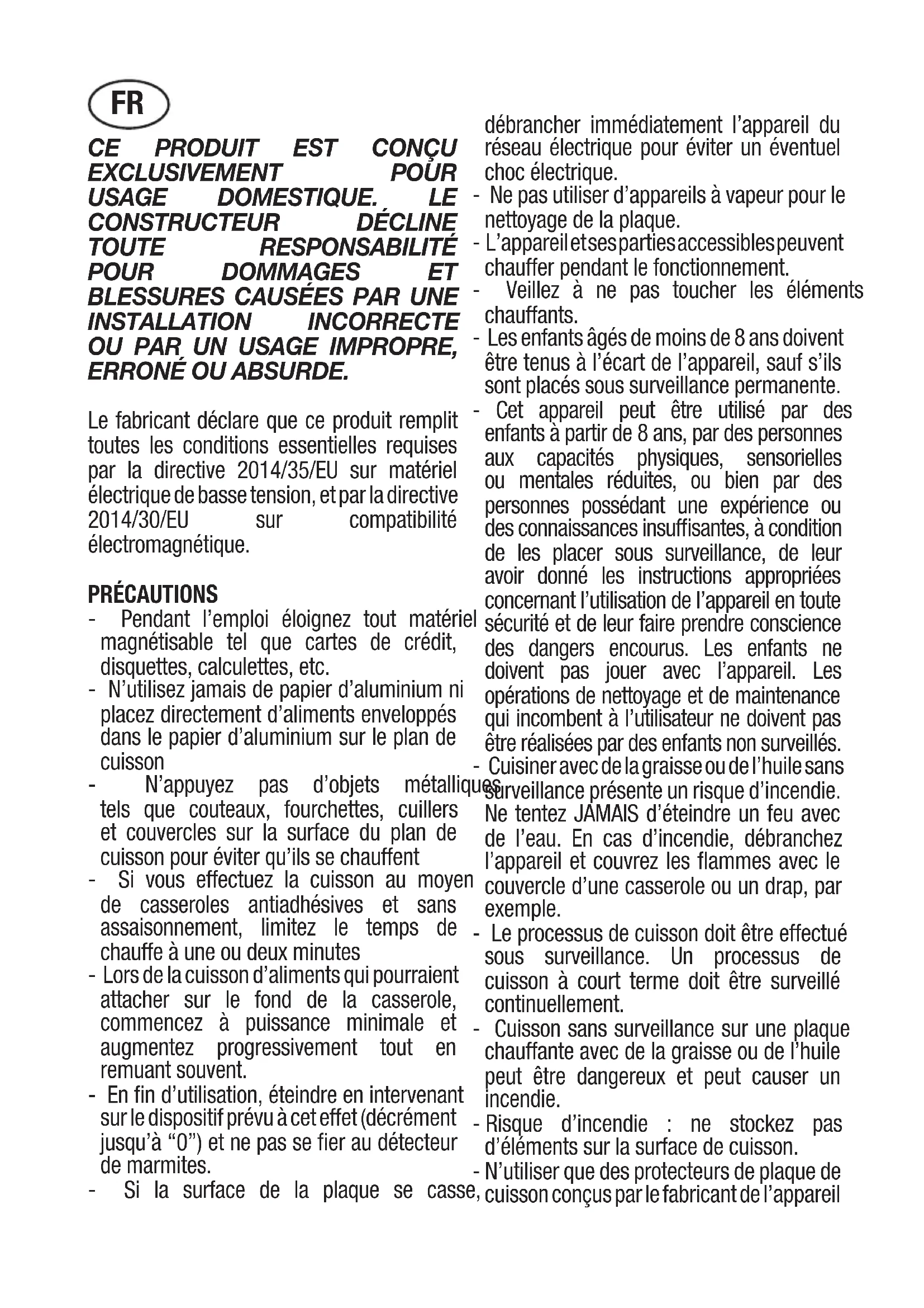 INSTALLATION INCORRECTE OU PAR UN USAGE IMPROPRE, ERRONÉ OU ABSURDE. Le fabricant déclare que ce produit remplit toutes les conditions essentielles requises par la directive 2014/35/EU sur matériel électrique de basse tension, et par la directive 2014/30/EU sur compatibilité électromagnétique. PRÉCAUTIONS - Pendant l’emploi éloignez tout matériel magnétisable tel que cartes de crédit, disquettes, calculettes, etc. - N’utilisez jamais de papier d’aluminium ni placez directement d’aliments enveloppés dans le papier d’aluminium sur le plan de cuisson - N’appuyez pas d’objets métalliques tels que couteaux, fourchettes, cuillers et couvercles sur la surface du plan de cuisson pour éviter qu’ils se chauffent - Si vous effectuez la cuisson au moyen de casseroles antiadhésives et sans assaisonnement, limitez le temps de chauffe à une ou deux minutes - Lors de la cuisson d’aliments qui pourraient attacher sur le fond de la casserole, commencez à puissance minimale et augmentez progressivement tout en remuant souvent. - En fin d’utilisation, éteindre en intervenant sur le dispositif prévu à cet effet (décrément jusqu’à “0”) et ne pas se fier au détecteur de marmites. - Si la surface de la plaque se casse, débrancher immédiatement l’appareil du réseau électrique pour éviter un éventuel choc électrique. - Ne pas utiliser d’appareils à vapeur pour le nettoyage de la plaque. - L’appareil et ses parties accessibles peuvent chauffer pendant le fonctionnement. - Veillez à ne pas toucher les éléments chauffants. - Les enfants âgés de moins de 8 ans doivent être tenus à l’écart de l’appareil, sauf s’ils sont placés sous surveillance permanente. - Cet appareil peut être utilisé par des enfants à partir de 8 ans, par des personnes aux capacités physiques, sensorielles ou mentales réduites, ou bien par des personnes possédant une expérience ou des connaissances insuffisantes, à condition de les placer sous surveillance, de leur avoir donné les instructions appropriées concernant l’utilisation de l’appareil en toute sécurité et de leur faire prendre conscience des dangers encourus. Les enfants ne doivent pas jouer avec l’appareil. Les opérations de nettoyage et de maintenance qui incombent à l’utilisateur ne doivent pas être réalisées par des enfants non surveillés. - Cuisiner avec de la graisse ou de l’huile sans surveillance présente un risque d’incendie. Ne tentez JAMAIS d’éteindre un feu avec de l’eau. En cas d’incendie, débranchez l’appareil et couvrez les flammes avec le couvercle d’une casserole ou un drap, par exemple. - Le processus de cuisson doit être effectué sous surveillance. Un processus de cuisson à court terme doit être surveillé continuellement. - Cuisson sans surveillance sur une plaque chauffante avec de la graisse ou de l’huile peut être dangereux et peut causer un incendie. - Risque d’incendie : ne stockez pas d’éléments sur la surface de cuisson. - N’utiliser que des protecteurs de plaque de cuisson conçus par le fabricant de l’appareil FRde cuisson, indiqués par le fabricant dans les consignes d’utilisation ou intégrés à l’appareil. L’utilisation de protecteurs non adaptés peut être à l’origine d’accidents. Installer dans le câblage fixe un dispositif de déconnexion du réseau électrique avec une séparation de contact sur tous les pôles qui permette une déconnexion totale dans des conditions de surtension de catégorie III, conformément à la norme de câblage. La prise ou l’interrupteur omnipolaire doivent être facilement accessibles après la mise en place de l’appareil. Cet appareil n’est pas prévu pour fonction- ner à l’aide d’un temporisateur externe ou d’un système de commande à distance indépendant. Le Constructeur décline toute responsa- bilité au cas où ces normes et les autre normes contre les accidents ne seraient pas observées. Sile cable d’alimentation s’abîme, demandez à votre servi ce d’as- sistance technique agrée, au fa- bricant ou bien à un technicien compétent de vous le changer, afin d’éviter un risque quel- conque. PRINCIPE DE FONCTIONNEMENT (Fig. 1) Il se base sur les propriétés électromagnétiques de la plupart des récipients de cuisson. Le circuit électronique contrôle le fonctionnement de la bobine (inducteur) qui crée un champ magnétique. C’est le récipient de cuisson même qui transmet la chaleur aux aliments. La cuisson a lieu comme décrit cidessous. - déperdition minimale (haut rendement) - le système s’arrête automatiquement si l’on retire ou seulement soulève la casserole - le système électronique garantit le maximum de flexibilité et de précision de réglage. (Fig. 1) 1 Casserole 2 Induced current 3 Champ magnétique 4 Inducteur 5 Circuit électronique 6 Alimentation électrique Instructions pour l’usager (Fig. 2) 1 Marche/arrêt ON/OFF 2 Moins – 3 Plus + 4 Zone de cuisson 5 Affichage du niveau de puissance 6 Voyant lumineux de sélection de zone Installation Toutes les opérations rélatives à l’installation (raccordement électrique) doivent être faites par un personnel qualifié, en conformité avec les normes en vigueur. En ce qui concerne les instructions spécifiques voir la partie réservée à l’installateur. Marche/arrêt de la commande sensitive Après la mise sous tension, il faut environ 1 seconde à la commande sensitive pour être prête à fonctionner. Après la réinitialisation de tous les afficheurs, les LEDS clignotent pendant 1 seconde environ. Puis les afficheurs et les LEDS s’éteignent et la commande sensitive se met en stand-by. Pour allumer le contact, appuyer sur la touche de mise en marche (1). Les afficheurs des foyers indiquent “0“. Le “0“ est remplacé par un “H“ quand le foyer est chaud. Le point en bas à droite de tous les afficheurs des foyers clignote toutes les secondes pour