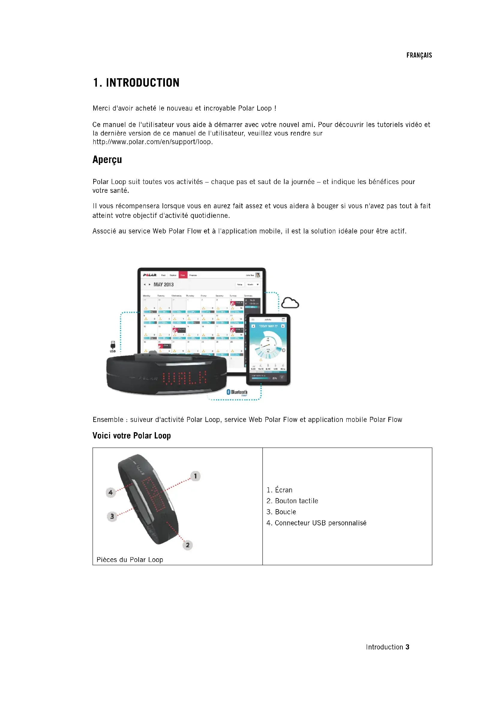 Merci d'avoir acheté le nouveau et incroyable Polar Loop ! Ce manuel de l'utilisateur vous aide à démarrer avec votre nouvel ami. Pour découvrir les tutoriels vidéo et la dernière version de ce manuel de l'utilisateur, veuillez vous rendre sur http://www.polar.com/en/support/loop. Aperçu Polar Loop suit toutes vos activités – chaque pas et saut de la journée – et indique les bénéfices pour votre santé. Il vous récompensera lorsque vous en aurez fait assez et vous aidera à bouger si vous n'avez pas tout à fait atteint votre objectif d'activité quotidienne. Associé au service Web Polar Flow et à l'application mobile, il est la solution idéale pour être actif. Ensemble : suiveur d'activité Polar Loop, service Web Polar Flow et application mobile Polar Flow Voici votre Polar Loop Pièces du Polar Loop