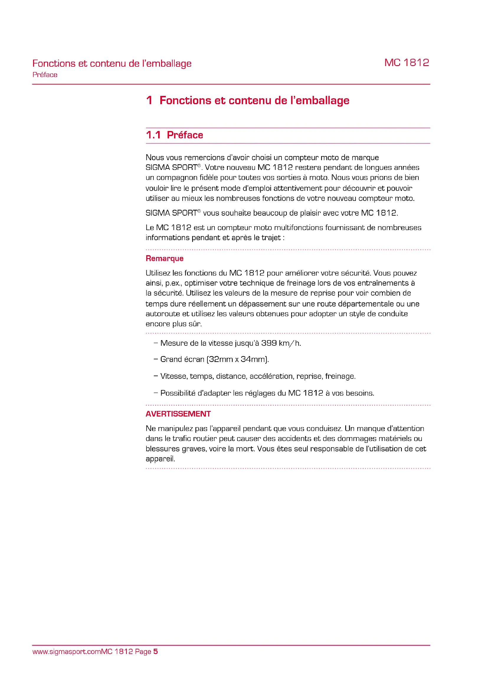 vous souhaite beaucoup de plaisir avec votre MC 1812. Le MC 1812 est un compteur moto multifonctions fournissant de nombreuses informations pendant et après le trajet : Remarque Utilisez les fonctions du MC 1812 pour améliorer votre sécurité. Vous pouvez ainsi, p.ex., optimiser votre technique de freinage lors de vos entraînements à la sécurité. Utilisez les valeurs de la mesure de reprise pour voir combien de temps dure réellement un dépassement sur une route départementale ou une autoroute et utilisez les valeurs obtenues pour adopter un style de conduite encore plus sûr. − Mesure de la vitesse jusqu′à 399 km/h. − Grand écran (32mm x 34mm). − Vitesse, temps, distance, accélération, reprise, freinage. − Possibilité d′adapter les réglages du MC 1812 à vos besoins. AVERTISSEMENT Ne manipulez pas l′appareil pendant que vous conduisez. Un manque d′attention dans le trafic routier peut causer des accidents et des dommages matériels ou blessures graves, voire la mort. Vous êtes seul responsable de l′utilisation de cet appareil.Contenu de l′emballage Fonctions et contenu de l′emballage www.sigmasport.com MC 1812 Page 6 MC 1812