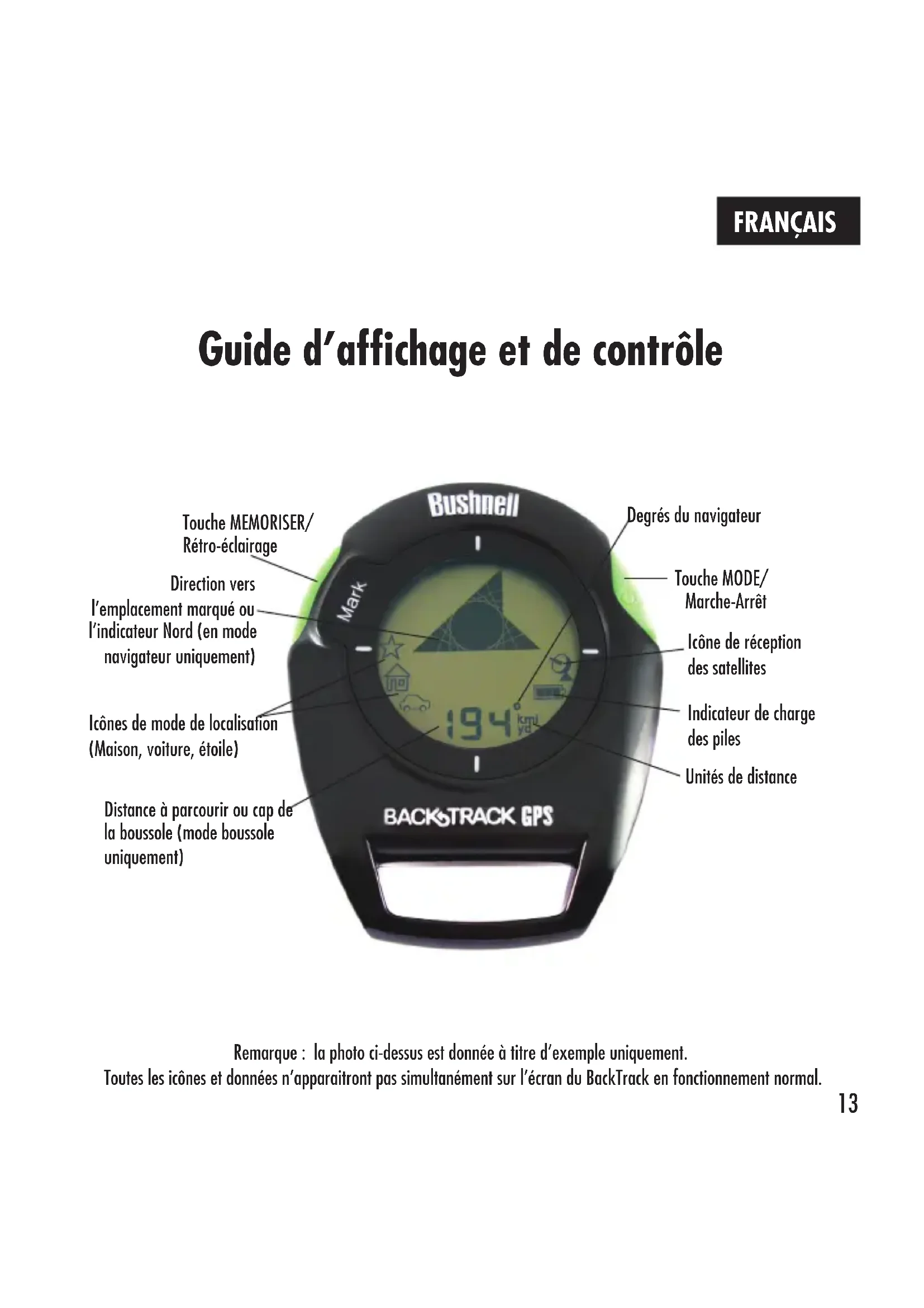prepaid to the address listed below: IN U.S.A. Send To: IN CANADA Send To: Bushnell Outdoor Products Bushnell Outdoor Products Attn.: Repairs Attn.: Repairs 9200 Cody 25A East Pearce Street, Unit 1 Overland Park, Kansas 66214 Richmond Hill, Ontario L4B 2M9 For products purchased outside the United States or Canada please contact your local dealer for applicable warranty information. In Europe you may also contact Bushnell at: Bushnell Germany GmbH European Service Centre Mathias-Brüggen-Str. 80 D-50827 Köln GERMANY Tel: +49 221 995568-0 Fax: +49 221 995568-20 This warranty gives you specific legal rights. You may have other rights which vary from country to country. ©2013 Bushnell Outdoor Products13 Touche MODE/ Marche-Arrêt Icône de réception des satellites Indicateur de charge des piles Unités de distance Distance à parcourir ou cap de la boussole (mode boussole uniquement) Icônes de mode de localisation (Maison, voiture, étoile) Touche MEMORISER/ Rétro-éclairage Degrés du navigateur FRANÇAIS Remarque : la photo ci-dessus est donnée à titre d’exemple uniquement. Toutes les icônes et données n’apparaitront pas simultanément sur l’écran du BackTrack en fonctionnement normal. Guide d’affichage et de contrôle Direction vers l’emplacement marqué ou l’indicateur Nord (en mode navigateur uniquement)14 1. Retirez le cache du compartiment à piles à l’arrière du BackTrack après avoir fait coulisser le bouton sur la position « déverrouiller » et insérez deux piles AAA (alcaline ou au lithium). Replacez le cache et repositionnez le bouton sur « verrouiller ». Lorsque l’icône d’état de charge des piles indique une charge faible, procédez au remplacement des piles. Assurez-vous que les contacts des piles sont propres et remplacez les deux piles en même temps. Si vous n’utilisez pas l’appareil pendant plusieurs semaines, rangez-le en ôtant les piles. Retirez le cache du compartiment à piles