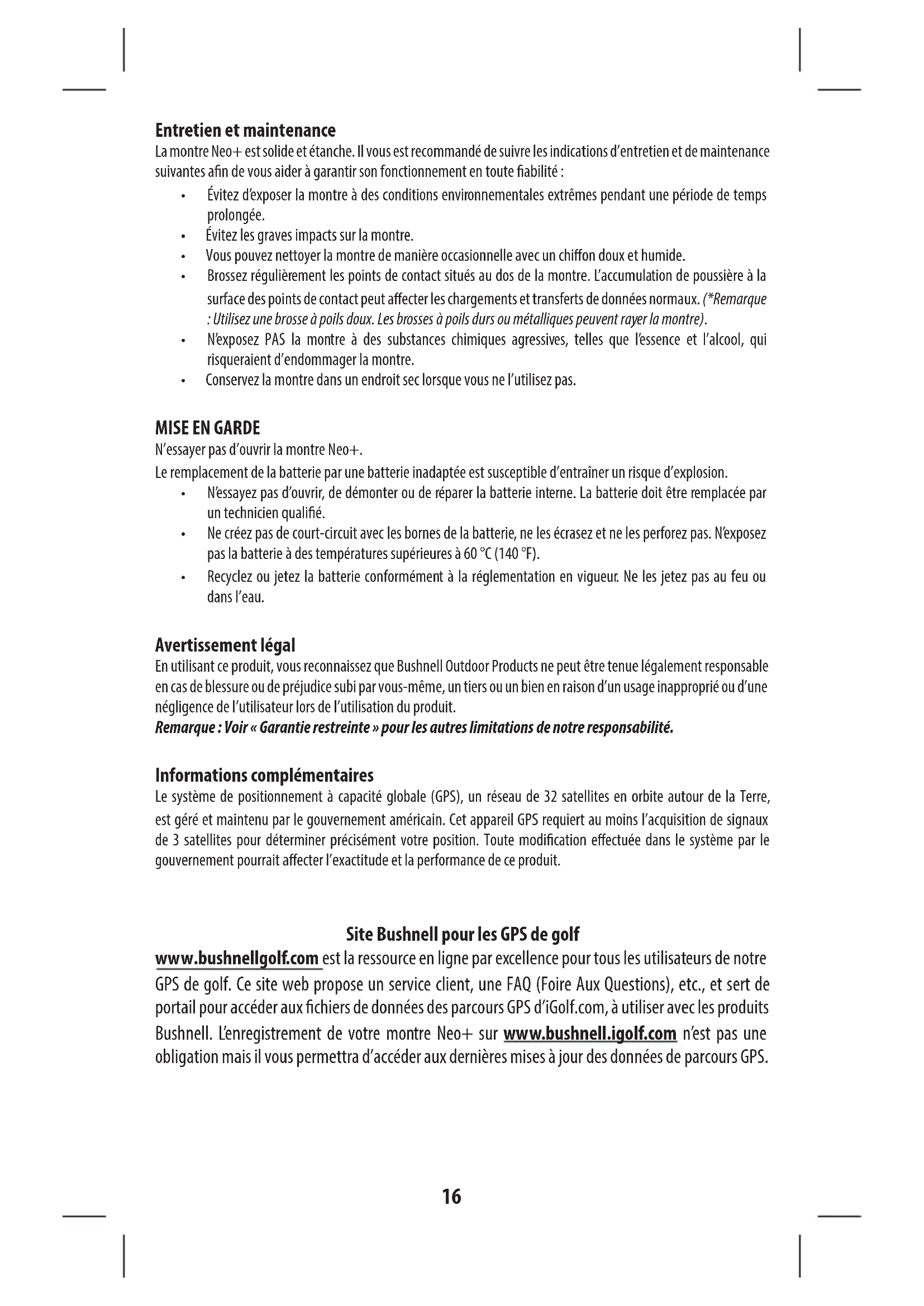 Appuyez sur SELECT Appuyez sur SELECT Appuyez sur SELECT Appuyez sur SELECT Mise à jour du GPS : Dénir l’option sur « On » permet d’actualiser l’heure par rapport au fuseau horaire sélectionné à l’acquisition du signal GPS. Pour que votre montre Neo+ puisse actualiser l’heure par rapport à votre position GPS, réglez le fuseau horaire sur l’option « By Longitude » (en longitude). L’heure sera automatiquement réglée après acquisition du signal GPS.La sélection des fuseaux horaires se base sur l’échelle du Temps universel coordonné (UTC). En France métropolitaine, le fuseau horaire est “UTC +1” en heure d’hiver, “UTC +2” en heure d’été.Réglage de l’heure au format standard ou militaire. Pour un format standard, sélectionnez 12 h. Pour un format militaire, sélectionnez 24 h.Réglage manuel de l’heure. Dénissez les mises à jour GPS sur « O » an que l’heure ne soit pas modiée lors de l’acquisition du signal GPS.Activez la tonalité des touches.Désactivez la tonalité des touches.Sélectionnez « Standard » : pour des mesures en yards et en miles.Sélectionnez « Metric » pour des mesures en mètres et kilomètres.Conservez les paramètres actuels et revenez au menu.Rétablissez les paramètres par défaut.26 Enregistrement et mise à jour des données de parcours de golf La création d’un compte gratuit et l’enregistrement de votre montre Neo+ sur www.bushnell.igolf.com n’est pas une obligation. En revanche, cela vous permettra de mettre à jour les cartes GPS préchargées dans votre votre montre, et d’en télécharger de nouvelles. L’inscription est gratuite et ne prend que quelques minutes. En vous inscrivant, vous bénécierez d’un accès aux dernières mises à jour des données GPS à utiliser sur votre appareil.