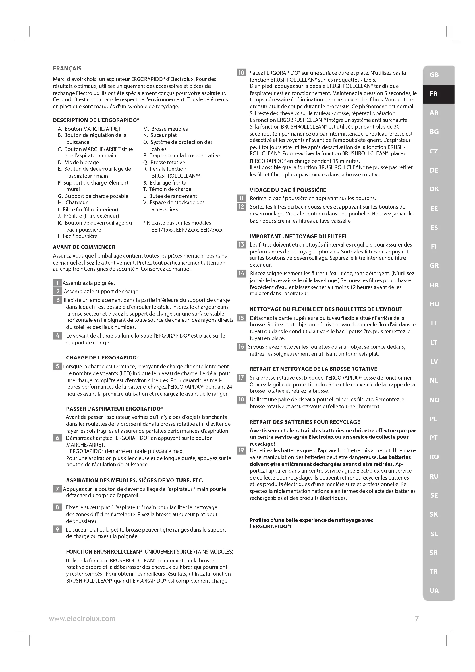 UAFRANÇAIS Merci d’avoir choisi un aspirateur ERGORAPIDO® d'Electrolux. Pour des résultats optimaux, utilisez uniquement des accessoires et pičces de rechange Electrolux. Ils ont été spécialement conçus pour votre aspirateur. Ce produit est conçu dans le respect de l'environnement. Tous les éléments en plastique sont marqués d'un symbole de recyclage.