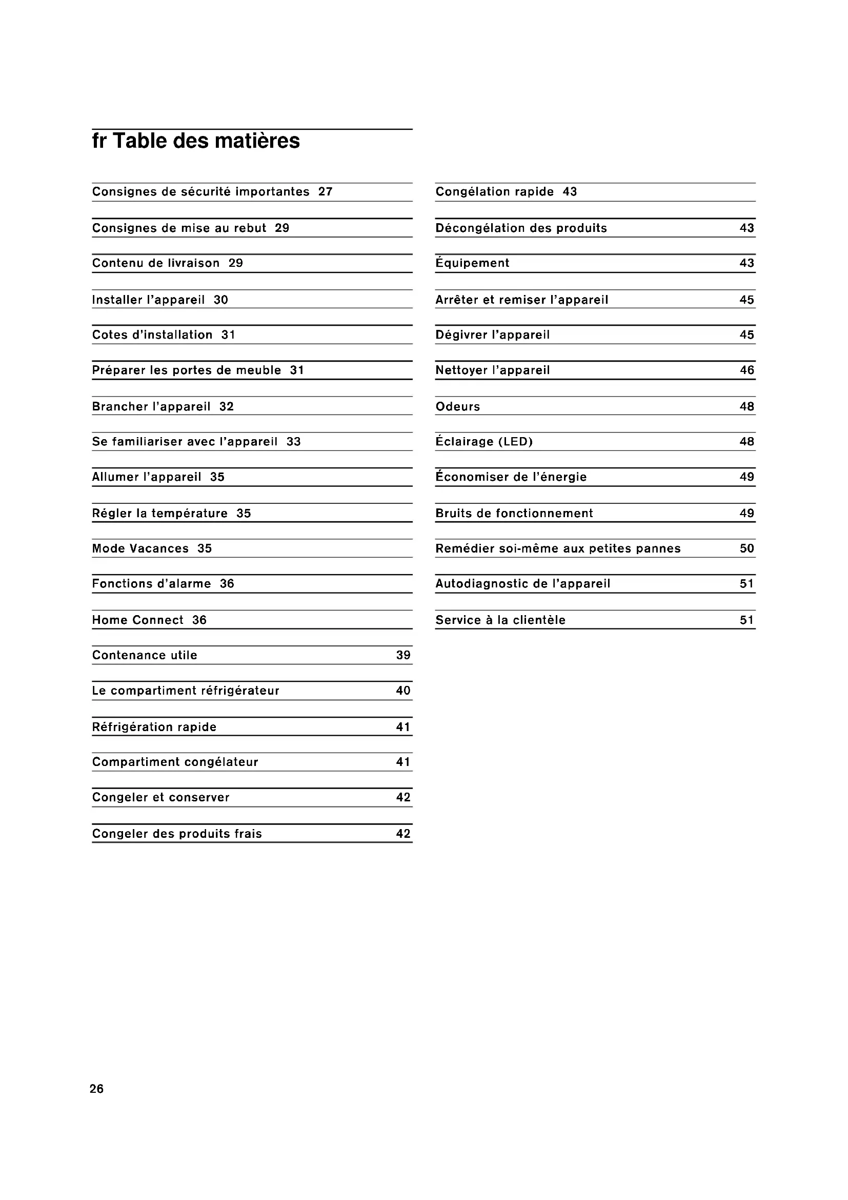 température du compartiment congélateur 3. L’affichage de température du compartiment congélateur 4 montre une animation. La mise à jour est en cours d’installation. Pendant l’installation, toutes les touches sont verrouillées. ▯ Si l’installation s’est achevée correctement, l’affichage de température du compartiment congélateur 4 indique On. ▯ Si l’installation ne s’est pas achevée correctement, l’affichage de température du compartiment congélateur 4 indique Er. Renouvelez la mise à jour ultérieurement. Si l’installation échoue, même après plusieurs tentatives, contactez le service à la clientèle. Remarque liée à la protection des données Lors de la première connexion de votre appareil frigorifique Home Connect à un réseau WLAN relié à Internet, votre appareil transmet les catégories suivantes de données au serveur Home Connect (premier enregistrement) : ▯ Code d’appareil univoque (constitué de clés d’appareil ainsi que de l’adresse MAC du module de communication Wi-Fi intégré). ▯ Certificat de sécurité du module de communication Wi-Fi (pour la protection technique des informations de la connexion). ▯ Version actuelle du logiciel et du matériel de votre appareil ménager. ▯ État d’une précédente restauration éventuelle des réglages d’usine. Ce premier enregistrement prépare l’utilisation des fonctionnalités Home Connect et n’est nécessaire que lors de votre première utilisation d’Home Connect. Remarque : Veuillez noter que les fonctionnalités Home Connect ne sont utilisables qu’en liaison avec l’appli Home Connect. Vous pouvez accéder aux informations sur la protection des données depuis l’appli Home Connect. Contenance utile Vous trouverez des indications sur la contenance utile sur la plaque signalétique de votre appareil (voir la figure au chapitre Service à la clientèle) . Utiliser l’intégralité du volume de congélation Pour pouvoir ranger une quantité maximale de produits congelés, vous pouvez retirez toutes les pièces d’équipement. Vous pouvez ainsi empiler les aliments directement sur les clayettes et le plancher du compartiment congélateur. Retirer les pièces d’équipement Tirez le bac à produits congelés jusqu’à la butée, soulevez-le par l’avant puis retirez-le.40 Le compartiment réfrigérateur Le compartiment réfrigérateur est l’endroit idéal où ranger la viande, la charcuterie, le poisson, les produits laitiers, les œufs, les plats précuisinés et les pâtisseries. Consignes de rangement ▯ Rangez des produits alimentaires frais et intacts. Ils conserveront ainsi plus longtemps leur qualité et leur fraîcheur. ▯ Respectez la date de conservation minimum ou la date de consommation indiquée par le fabricant pour les produits tout prêts et liquides conditionnés. ▯ Pour préserver l’arôme, la teinte et la fraîcheur, rangez les produits alimentaires bien emballés ou couverts. Ceci empêche que certains aliments ne communiquent leur goût à d’autres et que les pièces en plastique changent anormalement de couleur. ▯ Attendez que les boissons et aliments chauds aient refroidi à la température de la pièce avant de les ranger dans l’appareil. Remarque : Évitez que les produits alimentaires n’entrent en contact avec la paroi arrière. Cela risquerait de gêner la circulation de l’air. Les produits alimentaires ou les emballages pourraient rester collés, par congélation, contre la paroi arrière. Tenez compte des différentes zones froides dans le compartiment réfrigérateur L’air circulant dans le compartiment réfrigérateur entraîne l’apparition de différentes zones de froid : ▯ La zone la plus froide se trouve entre la flèche imprimée sur le côté et sur la clayette qui se trouve en dessous. Remarque : Rangez-y les aliments les plus délicats (par ex. le poisson, la charcuterie, la viande). ▯ La zone la moins froide se trouve tout en haut de la porte. Remarque : Rangez-y par ex. le fromage dur et le beurre. Le fromage peut ainsi continuer à développer son arôme, tandis que le beurre reste facile à tartiner.41 Bac à légumes avec régulateur d’humidité Le bac à légumes est l’endroit optimal où ranger les fruits et légumes frais. Un régulateur d’humidité et un joint spécial permettent d’ajuster l’humidité de l’air dans le bac à légumes. Les fruits et légumes frais se conservent ainsi jusqu’à deux fois plus longtemps que dans un compartiment conventionnel. Vous pouvez ajuster l’humidité de l’air régnant dans le bac à légumes en fonction de la nature et de la quantité des produits à ranger : ▯ Fruits principalement et appareil très rempli – humidité de l’air moins élevée ▯ Légumes principalement et appareil rempli de produits différents ou faiblement rempli – humidité de l’air plus élevée Remarque : Il est recommandé de ranger les fruits (par exemple les ananas, bananes, papayes, agrumes) et légumes (par exemple les aubergines, concombres, courgettes, poivrons, tomates et pommes de terre) qui sont sensibles au froid à l’extérieur du réfrigérateur, à des températures avoisinant +46 °F (+8 °C) à +54 °F (+12 °C) afin d’en préserver la qualité et l’arôme. Remarque : Selon la quantité et la nature des produits stockés, de l’eau pourrait se condenser dans le bac à légumes. Retirez l’eau condensée avec un essuie-tout sec et ajustez l’humidité de l’air dans le bac à légumes via le régulateur d’humidité. Réfrigération rapide Pendant la réfrigération rapide, la température dans le réfrigérateur descend le plus bas possible pendant env. 15 heures. Ensuite, l’appareil retourne automatiquement à la température réglée avant que vous n’activiez la réfrigération rapide. Activez la réfrigération rapide par exemple : ▯ avant de ranger de grandes quantités d’aliments. ▯ Afin de réfrigérer rapide