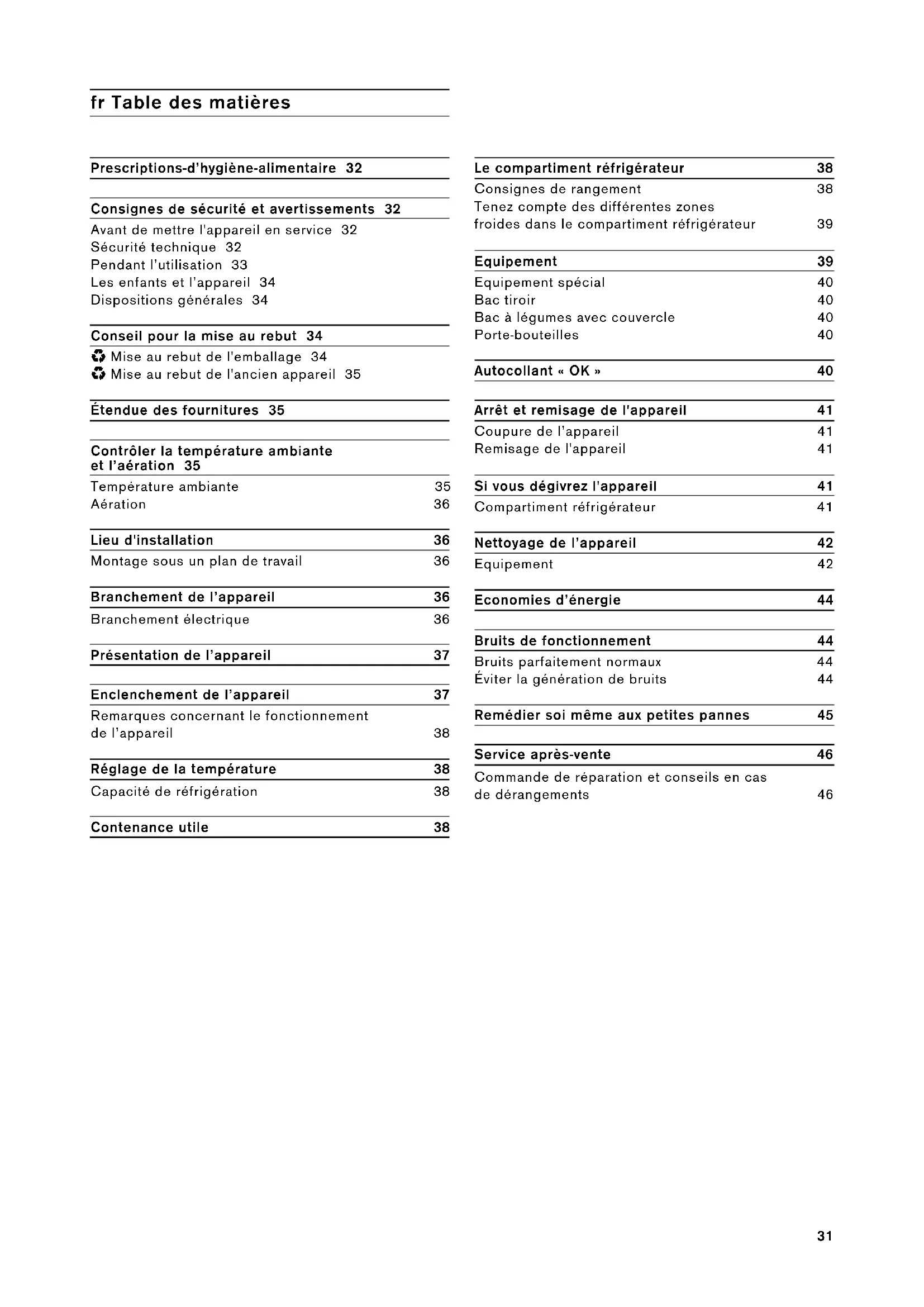 - Mise au rebut de l'ancien appareil 35 Étendue des fournitures 35 Contrôler la température ambiante et l’aération 35 Température ambiante 35 Aération 36 Lieu d'installation 36 Montage sous un plan de travail 36 Branchement de l’appareil 36 Branchement électrique 36 Présentation de l’appareil 37 Enclenchement de l’appareil 37 Remarques concernant le fonctionnement de l’appareil 38 Réglage de la température 38 Capacité de réfrigération 38 Contenance utile 38 Le compartiment réfrigérateur 38 Consignes de rangement 38 Tenez compte des différentes zones froides dans le compartiment réfrigérateur 39 Equipement 39 Equipement spécial 40 Bac tiroir 40 Bac à légumes avec couvercle 40 Porte-bouteilles 40 Autocollant « OK » 40 Arrêt et remisage de l'appareil 41 Coupure de l’appareil 41 Remisage de l'appareil 41 Si vous dégivrez l'appareil 41 Compartiment réfrigérateur 41 Nettoyage de l’appareil 42 Equipement 42 Economies d’énergie 44 Bruits de fonctionnement 44 Bruits parfaitement normaux 44 Éviter la génération de bruits 44 Remédier soi même aux petites pannes 45 Service après-vente 46 Commande de réparation et conseils en cas de dérangements 4632 Prescriptions-d’hygiène-alimentaire Chère cliente, cher client, conformément à la réglementation française visant à empêcher la présence de listeria dans le compartiment réfrigérateur, nous vous remercions de respecter les consignes suivantes : ▯ Nettoyez fréquemment le compartiment intérieur du réfrigérateur à l’aide d’un détergent non agressif, ne provoquant pas d’oxydation des pièces métalliques (utilisez par ex. de l’eau tiède additionnée d’un peu de produit à vaisselle).Ensuite, désinfectez avec de l’eau additionnée de vinaigre ou de jus de citron les surfaces que vous avez préalablement nettoyées, ou utilisez un produit germicide en vente dans le commerce et adapté aux réfrigérateurs (avant d’utiliser ce produit sur les pièces métalliques, faites un test de compatibilité à un endroit peu visible). ▯ Enlevez les emballages commerciaux avant de mettre les produits alimentaires dans le compartiment réfrigérateur (par ex. le carton qui réunit les pots de yaourt). ▯ Pour éviter toute contamination entre des produits alimentaires de nature différente, rangez-les bien séparés les uns des autres, bien emballés ou rangés dans des récipients à couvercle. ▯ Avant de préparer des plats et de saisir des produits alimentaires, lavez-vous les mains. Avant de préparer d’autres plats, lavez-vous à nouveau les mains. Lavez-les encore une fois avant de prendre un repas. ▯ Lavez les ustensiles de cuisine dont vous venez de vous servir avant de les réutiliser (cuillère en bois, planche de découpe, couteau de cuisine, etc.). m Consignes de sécurité et avertissements Avant de mettre l'appareil en service Veuillez lire attentivement et entièrement les informations figurant dans les notices d'utilisation et de montage. Elle contiennent des remarques importantes concernant l'installation, l'utilisation et l'entretien de l'appareil. Le fabricant décline toute responsabilité si les consignes et mises en garde contenues dans la notice d'utilisation ne sont pas respectées. Veuillez conserver ces documents en vue d’une réutilisation ultérieure ou pour le cas où l’appareil changerait de propriétaire. Sécurité technique L'appareil contient une petite quantité de R600a, un fluide réfrigérant respectueux de l'environnement, mais inflammable. Pendant le transport et la mise en place de l'appareil, veillez à ne pas endommager les tuyauteries du circuit frigorifique. Le fluide réfrigérant peut s’enflammer en jaillissant ou provoquer des blessures oculaires. Si l'appareil est endommagé ▯ éloignez de l'appareil toute flamme nue ou source d'inflammation, ▯ aérez bien la pièce pendant quelques minutes, ▯ éteignez l'appareil puis débranchez la fiche mâle de la prise de courant, ▯ prévenez le service après-vente.33 Plus l'appareil contient du fluide réfrigérant et plus grande doit être la pièce dans laquelle il se trouve. Dans les pièces trop petites, un mélange gaz-air inflammable peut se former en cas de fuite. Comptez 1 m³ de volume minimum de la pièce pour 8 g de fluide réfrigérant. La quantité de fluide présente dans l'appareil est indiquée sur la plaque signalétique située à l'intérieur de ce dernier. Si le cordon d’alimentation électrique de cet appareil a été endommagé, il faut confier son remplacement au fabricant, au service après- vente ou à une personne détenant des qualifications similaires. Les installations et réparations inexpertes peuvent engendrer des risques considérables pour l’utilisateur. Les réparations ne pourront être réalisées que par le fabricant, le service après-vente ou une personne détenant des qualifications similaires. Il ne faut utiliser que les pièces d'origine du fabricant. Le fabricant ne garantit que les pièces d'origine car elles seules remplissent les exigences de sécurité. S’il faut allonger le cordon de raccordement au secteur avec un prolongateur, procurez- vous-le exclusivement auprès du service après-vente. Pendant l’utilisation ▯ N’utilisez pas d’appareils électriques à l’intérieur de l’appareil (par ex. appareils de chauffage, machine à glaçons, etc.). Risque d’explosion ! ▯ Ne nettoyez jamais l’intérieur de l’appareil avec un nettoyeur à vapeur ! La vapeur risque d’atteindre des pièces électriques et de provoquer un court- circuit. Risque d’électrocution ! ▯ Pour détacher le givre ou les couches de glace, n’utilisez jamais d’objets pointus ou présentant des arêtes vives. Vous risqueriez d’endommager les tubulures dans lesquelles circule le produit réfrigérant. Si le fluide réfrigérant jaillit, il peut provoquer des lésions oculaires ou s’enflammer. ▯ Ne stockez dans l’appareil n