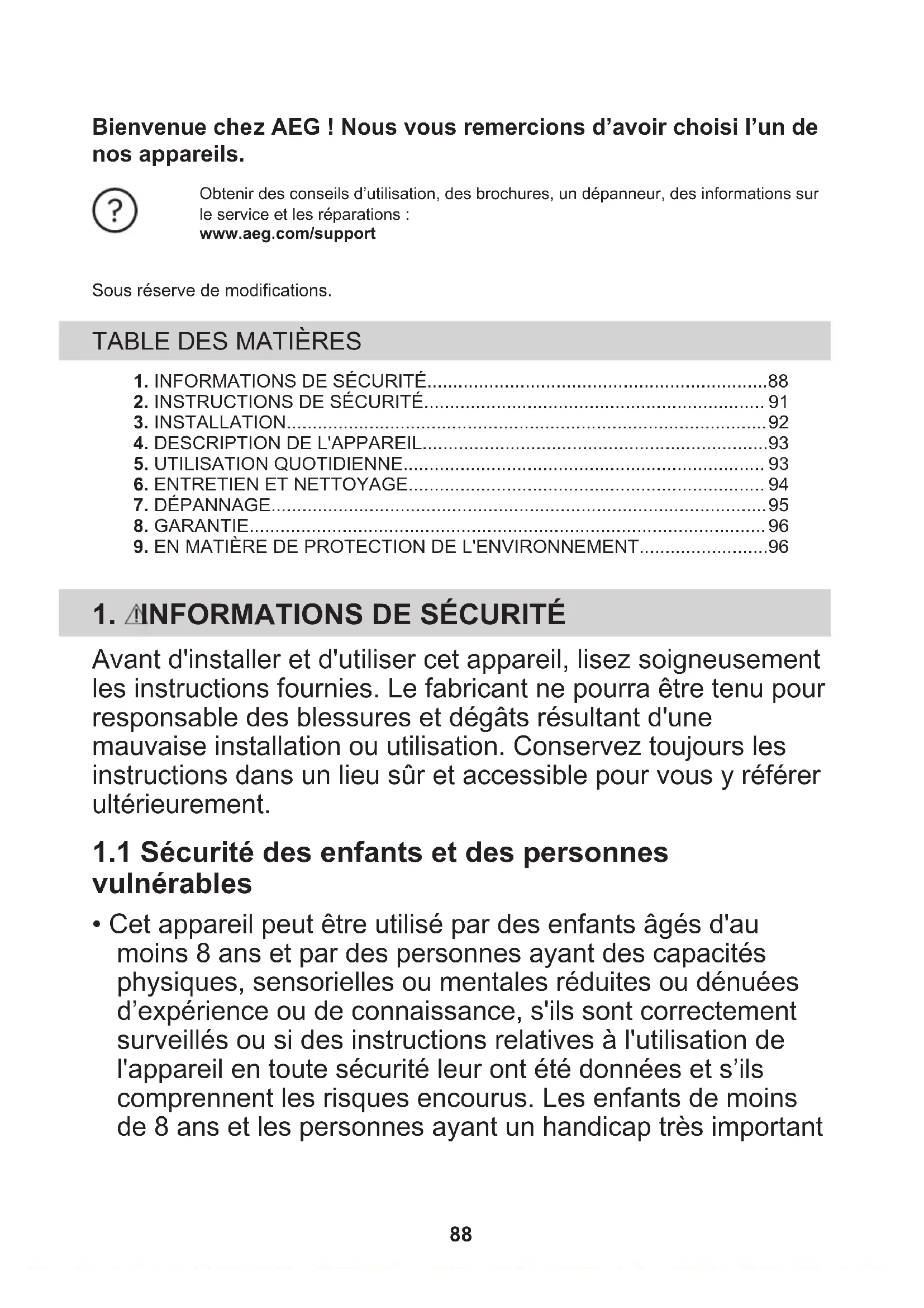 Recyclez les matériaux portant le symbole . Déposez les emballages dans les conteneurs prévus à cet effet. Contribuez à la protection de l'environnement et à votre sécurité, recyclez vos produits électriques et électroniques. Ne jetez pas les appareils portant le symbole avec les ordures ménagères. Emmenez un tel produit dans votre centre local de recyclage ou contactez vos services municipaux. 96Pour la Suisse: Où aller avec les appareils usagés ? Partout où des appareils neufs sont vendus, mais aussi dans un centre de collecte ou une entreprise de récupération officiels SENS. La liste des centres de collecte officiels SENS est disponible sous www.erecycling.ch Concerne la France uniquement : 97Dobro došli u AEG! Hvala vam što ste odabrali naš uređaj. Dobit ćete savjete o korištenju, rješavanju problema, brošure i informacije o servisu ipopravcima:www.aeg.com/supportZadržava se pravo na izmjene. SADRŽAJ