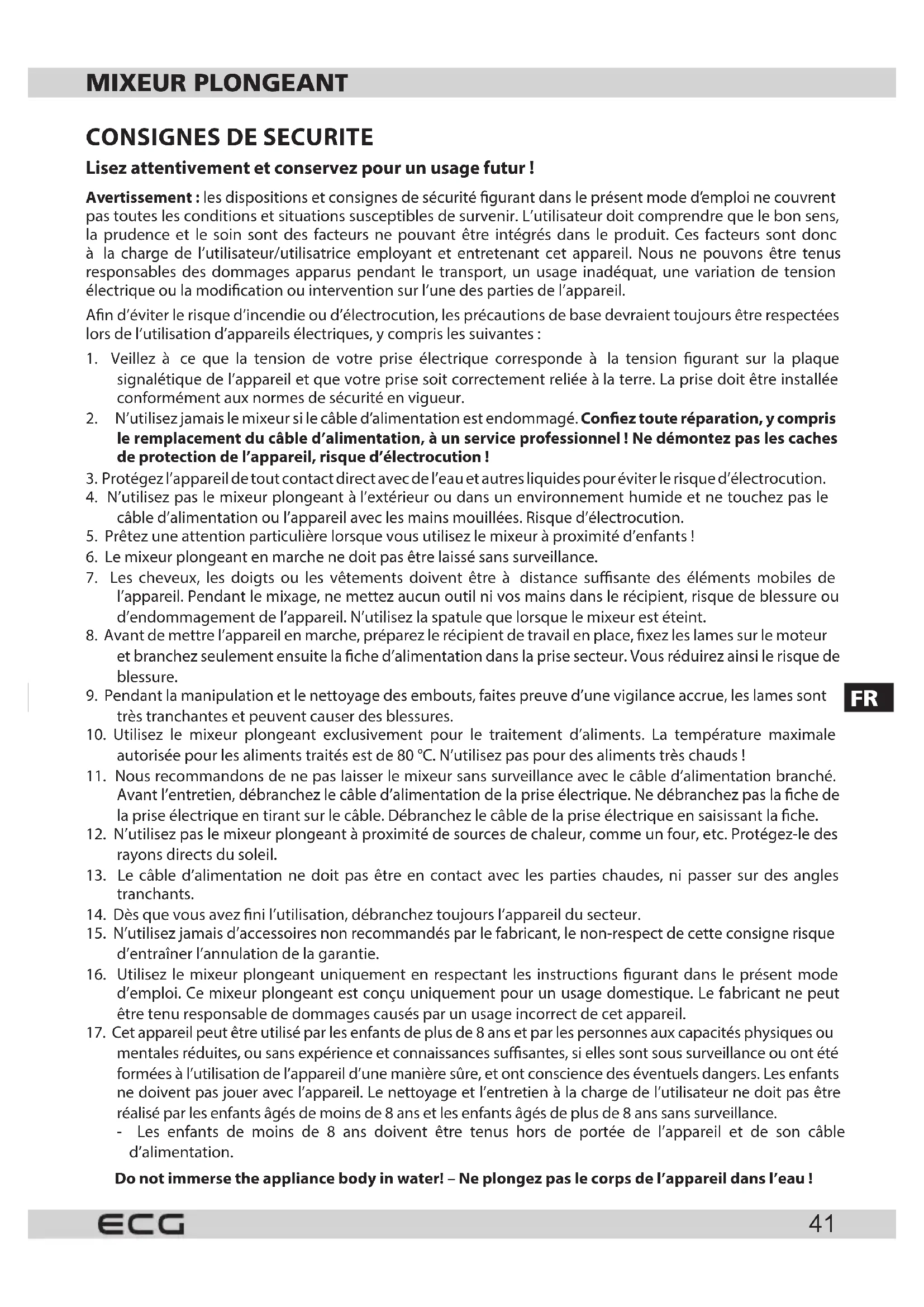 mentales réduites, ou sans expérience et connaissances susantes, si elles sont sous surveillance ou ont été formées à l’utilisation de l’appareil d’une manière sûre, et ont conscience des éventuels dangers. Les enfants ne doivent pas jouer avec l’appareil. Le nettoyage et l’entretien à la charge de l’utilisateur ne doit pas être réalisé par les enfants âgés de moins de 8 ans et les enfants âgés de plus de 8 ans sans surveillance. - Les enfants de moins de 8 ans doivent être tenus hors de portée de l’appareil et de son câble d’alimentation. Do not immerse the appliance body in water! – Ne plongez pas le corps de l’appareil dans l’eau!FR