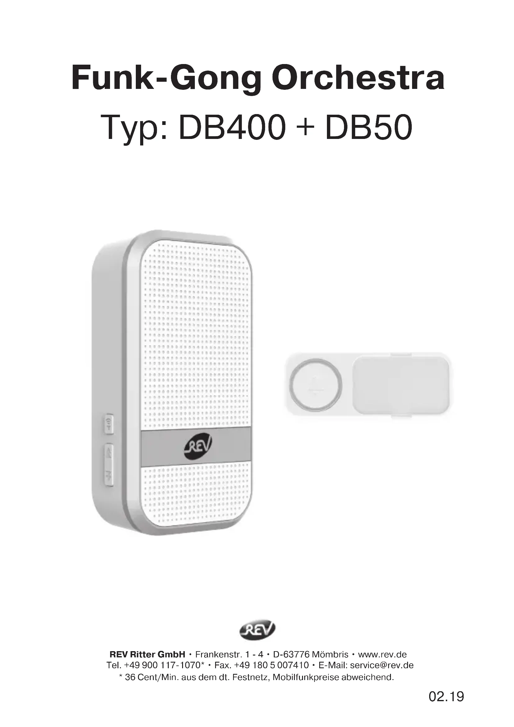 Consignes d’élimination conformément à la directive DEEE (déchets d’équipements électroniques et électriques) Les appareils électriques et électroniques usagés ne doivent plus être jetés dans les ordures non triées conformément aux prescriptions européennes. Le symbole de la poubelle à roulettes indique le caractère indispensable de la collecte séparée des déchets. Aidez-nous à protéger l’environnement et veillez à éliminer l’appareil, si vous ne l’utilisez plus, dans les systèmes de collecte séparée prévus à cet effet. DIRECTIVE 2012/19/EU DU PARLEMENT EUROPÉEN ET DU CONSEIL du 04 juillet 2012 relative aux déchets d’équipements électriques et électroniques. Consignes d’élimination des piles Les piles et les accumulateurs ne doivent pas être éliminés avec les ordures ménagères. Selon la législation en vigueur, chaque consommateur est tenu de remettre toutes les piles et tous les accumulateurs - qu’ils contiennent ou non des substances nocives - à un centre de collecte de sa commune ou de son quartier ou encore dans le commerce pour qu’ils soient éliminés dans le respect de l’environnement. Veuillez n’éliminer les piles et les accumulateurs que lorsqu’ils sont déchargés ! Déclaration de conformité CE Par la présente, la société REV Ritter GmbH déclare que le type de système radio DB400 + DB50 répond aux exigences de la DIRECTIVE 2014/53/EU. Vous trouverez une déclaration de conformité CE complète à l’adresse : www.rev.de au numéro de type ou d’article correspondant. produits compatibles numéro d‘ article numéro de type désignation 0082600103 DB500 + DB50 Carillon radio Orchestra carré blanc + bouton d‘appel Orchestra blanc 0082610103 DB500AC + DB50 Carillon radio Orchestra carré pour prise électrique blanc + bouton d‘appel Orchestra blanc 0082620103 DB400 + DB50 Carillon radio Orchestra rectangulaire blanc + bouton d‘appel Orchestra blanc 0082630103 DB400AC + DB50 Carillon radio Orchestra rectangulaire pour prise électrique blanc + bouton d‘appel Orchestra blanc 0083950103 DB50 Bouton d‘appel radio Orchestra blanc 0083960103 SA-IR07-NWX03-D Détecteur de mouvement Orchestra blanc 0083970103 SA-MC08-N04-D Contact de fenêtre radio Orchestra blanc 0082650103 B6 (AC) + B6 (DC) + DB50 Set carillon radio Orchestra Carillon Q + Carillon Q prise électrique blanc + bouton d‘appel blanc 0082640103 B7 (DC)