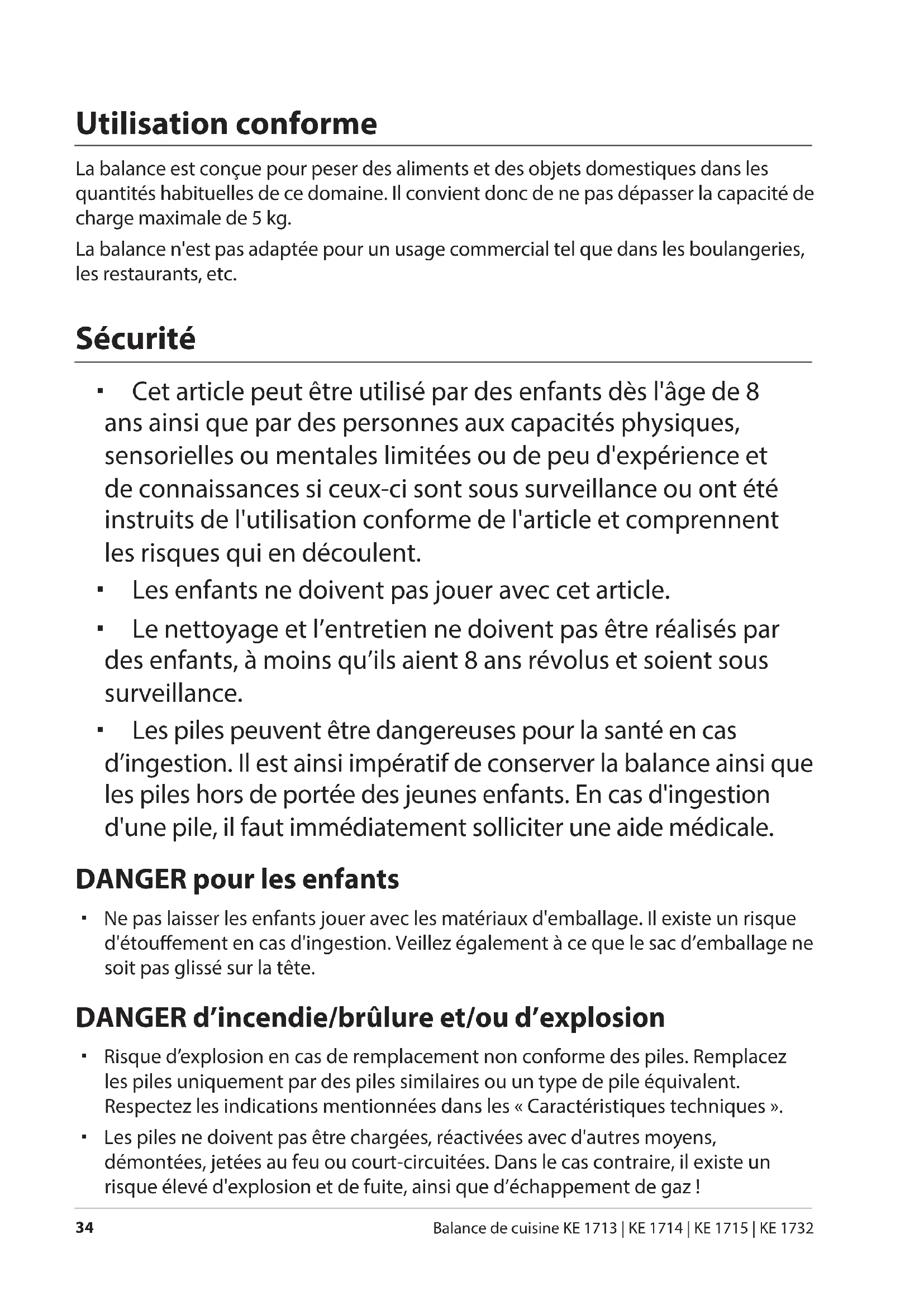 Balance de cuisine KE 1713 | KE 1714 | KE 1715 | KE 1732 Utilisation conforme La balance est conçue pour peser des aliments et des objets domestiques dans les quantités habituelles de ce domaine. Il convient donc de ne pas dépasser la capacité de charge maximale de 5 kg. La balance n'est pas adaptée pour un usage commercial tel que dans les boulangeries, les restaurants, etc. Sécurité Cet article peut être utilisé par des enfants dès l'âge de 8 ans ainsi que par des personnes aux capacités physiques, sensorielles ou mentales limitées ou de peu d'expérience et de connaissances si ceux-ci sont sous surveillance ou ont été instruits de l'utilisation conforme de l'article et comprennent les risques qui en découlent. Les enfants ne doivent pas jouer avec cet article. Le nettoyage et l’entretien ne doivent pas être réalisés par des enfants, à moins qu’ils aient 8 ans révolus et soient sous surveillance. Les piles peuvent être dangereuses pour la santé en cas d’ingestion. Il est ainsi impératif de conserver la balance ainsi que les piles hors de portée des jeunes enfants. En cas d'ingestion d'une pile, il faut immédiatement solliciter une aide médicale. DANGER pour les enfants Ne pas laisser les enfants jouer avec les matériaux d'emballage. Il existe un risque d'étouement en cas d'ingestion. Veillez également à ce que le sac d’emballage ne soit pas glissé sur la tête. DANGER d’incendie/brûlure et/ou d’explosion Risque d’explosion en cas de remplacement non conforme des piles. Remplacez les piles uniquement par des piles similaires ou un type de pile équivalent. Respectez les indications mentionnées dans les «Caractéristiques techniques». Les piles ne doivent pas être chargées, réactivées avec d'autres moyens, démontées, jetées au feu ou court-circuitées. Dans le cas contraire, il existe un risque élevé d'explosion et de fuite, ainsi que d’échappement de gaz!Sécurité
