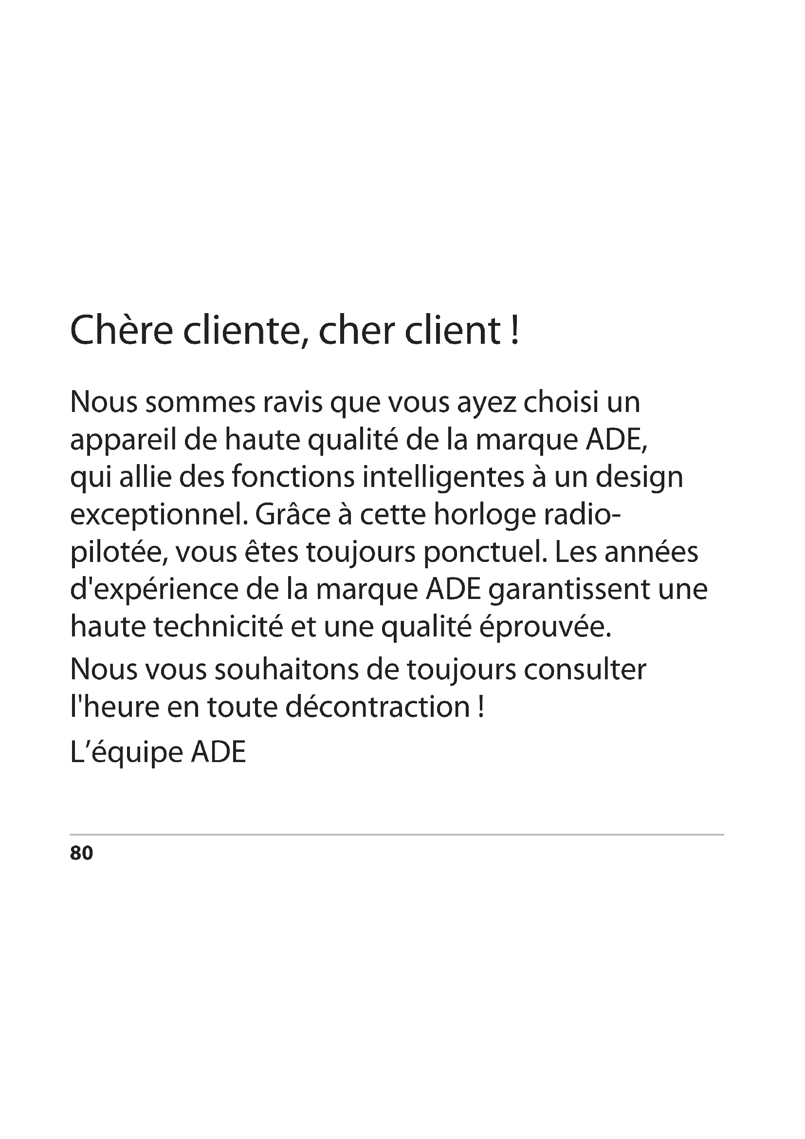 Fréquence de réception : 77,5 kHz Intensité nominale : < 40 mA Plage de mesure : env. 0 °C à 50 °C (32 °F à 122 °F) Distributeur (aucune adresse de service) : GRENDS GmbH Stahltwiete 23 22761Hambourg/Allemagne Nos produits font l’objet de développements et d’améliorations continuels. Pour cette raison, des modifications de design et des modifications techniques peuvent survenir à tout moment. Déclaration de conformité La société GRENDS GmbH déclare par la présente que l’horloge radiopilotée CK 1704 est conforme aux directives 2014/53/UE et 2011/65/UE. Le texte intégral de la Déclaration de conformité européenne est disponible à l’adresse www.ade-germany.de/doc.102 Cette déclaration perd sa validité si l’article subit des modifications sans notre assentiment. à Hambourg, mai 2023 GRENDS GmbH Garantie La société GRENDS GmbH garantit la prise en charge gratuite de défauts matériels ou de fabrication pendant 2 ans à partir de la date d’achat, par une réparation ou un remplacement. Dans le cas où vous souhaitez faire usage de cette garantie, veuillez remettre l'article ainsi que la preuve d'achat (en indiquant les raisons de votre réclamation) à votre revendeur.103