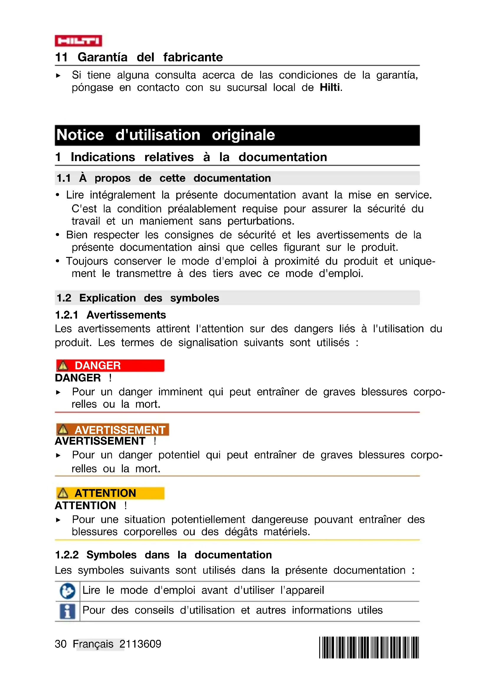Nous déclarons sous notre seule et unique responsabilité que le produit décrit ici est conforme aux directives et normes en vigueur. Une copie de l'attestation délivrée par l'organisme de certification se trouve en fin de la présente documentation. Pour obtenir les documentations techniques, s'adresser à : Hilti Entwicklungsgesellschaft mbH | Zulassung Geräte | Hiltistraße 6 | 86916 Kaufering, DE 2 Sécurité
