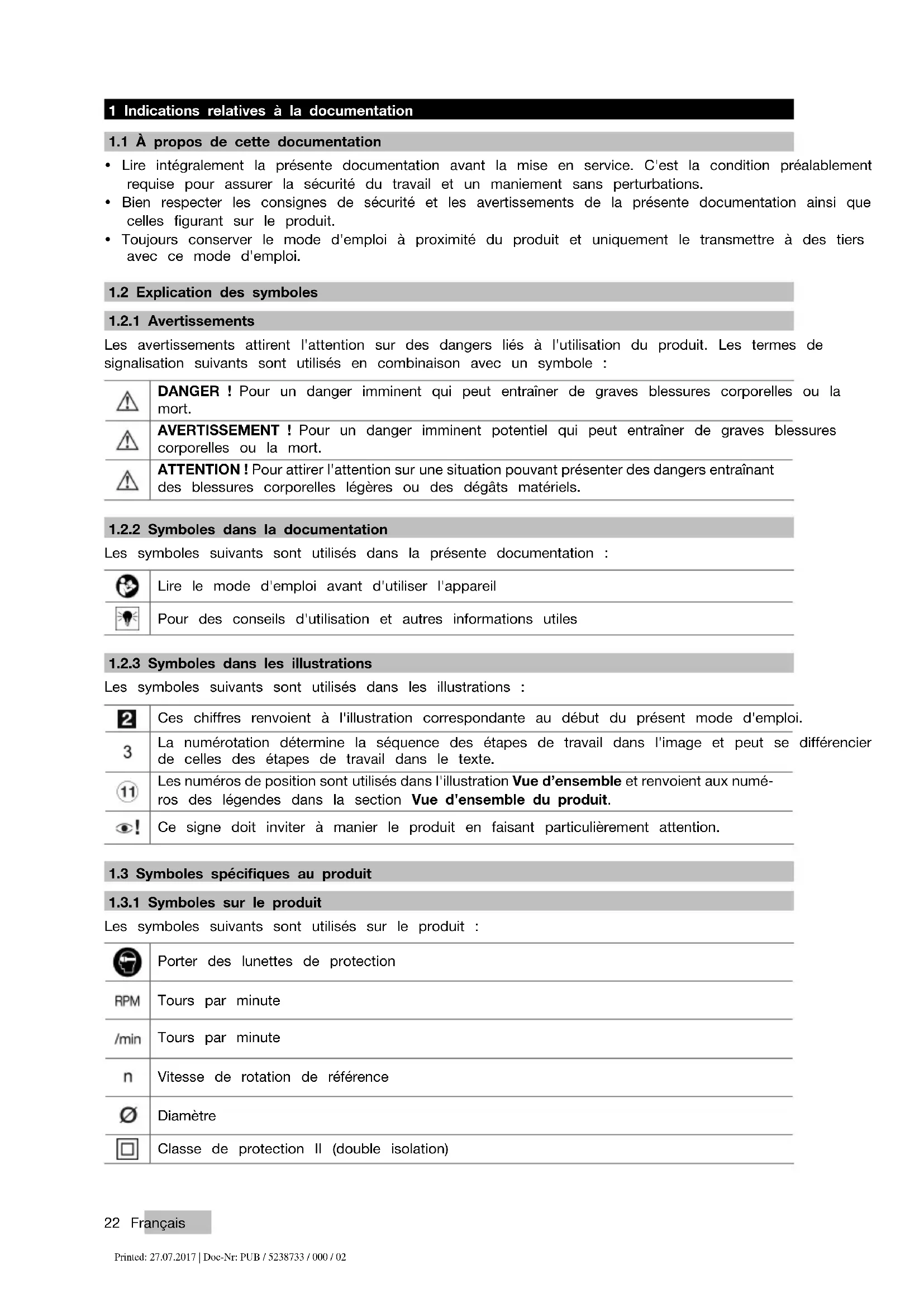 Les symboles suivants sont utilisés sur le produit : Porter des lunettes de protection Tours par minute Tours par minute Vitesse de rotation de référence Diamètre Classe de protection II (double isolation) Printed: 27.07.2017 | Doc-Nr: PUB / 5238733 / 000 / 02Français 23