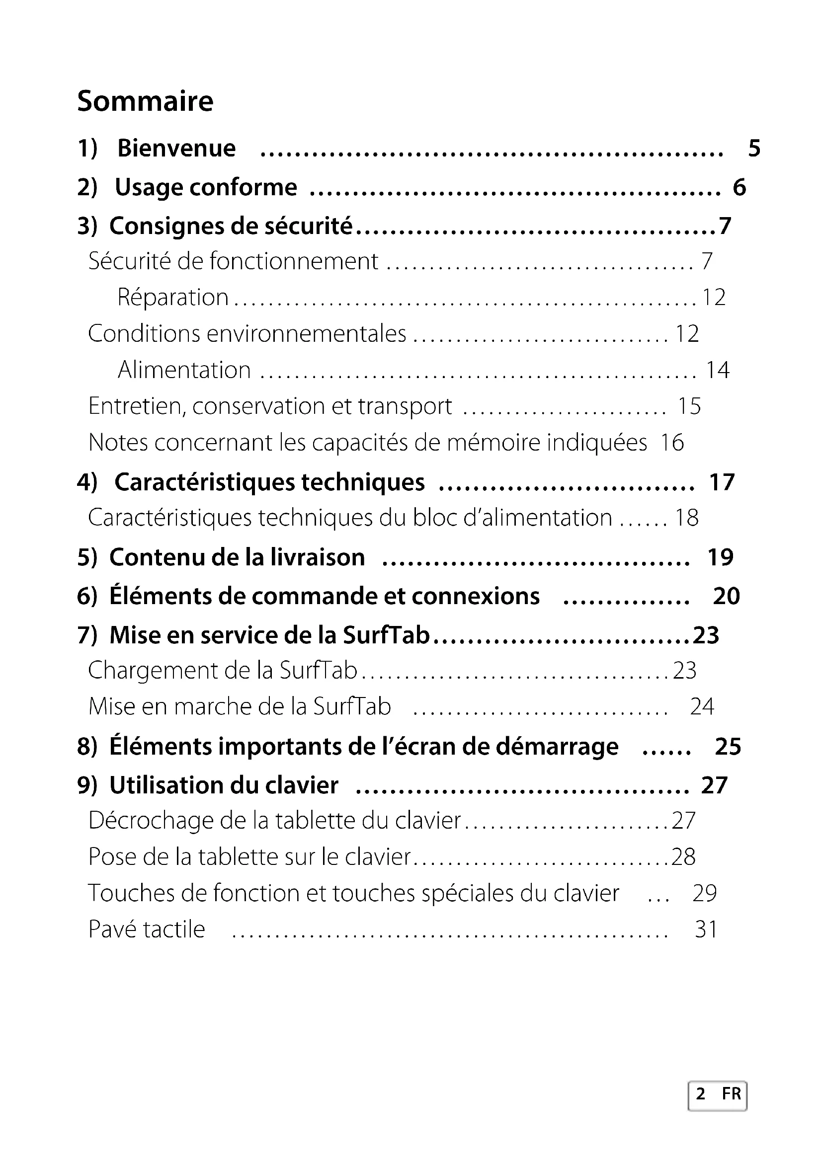 Votre nouvelle SurfTab est un appareil informatique permettant de naviguer sur Internet, d’utiliser des applications et des jeux, ainsi que de diffuser de la musique et des vidéos. Elle se compose d’une tablette tactile et d’un clavier de haute qualité à coque rigide. Une fixation articulée spéciale permet l’utilisation en mode ordinateur portable, avec différentes inclinaisons de l’écran, ainsi que l’extraction de la tablette de la fixation pour une utilisation en mode tablette. Utilisez l’appareil exclusivement aux fins prévues. Le fabricant décline toute responsabilité en cas de dommages résultant d’une utilisation non conforme de l’appareil ou en cas de modifications de celui-ci. En outre, le fabricant ne peut être tenu responsable des détériorations ou pertes de données, ni des dommages consécutifs.FR