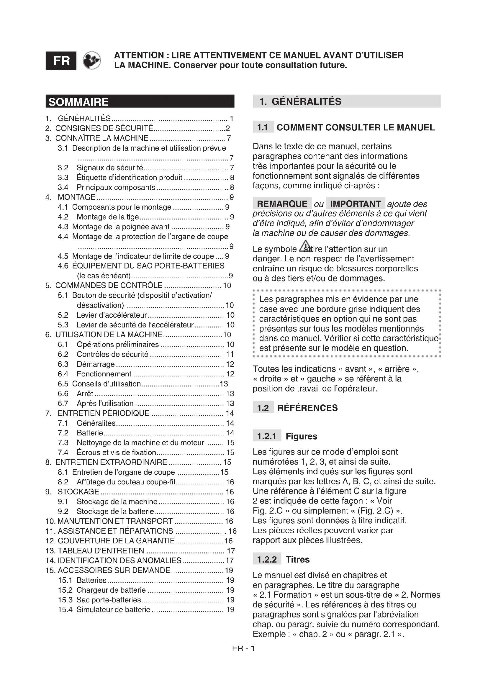 Le manuel est divisé en chapitres et en paragraphes. Le titre du paragraphe « 2.1 Formation » est un sous-titre de « 2. Normes de sécurité ». Les références à des titres ou paragraphes sont signalées par l’abréviation chap. ou paragr. suivie du numéro correspondant. Exemple : « chap. 2 » ou « paragr. 2.1 ». SOMMAIRE