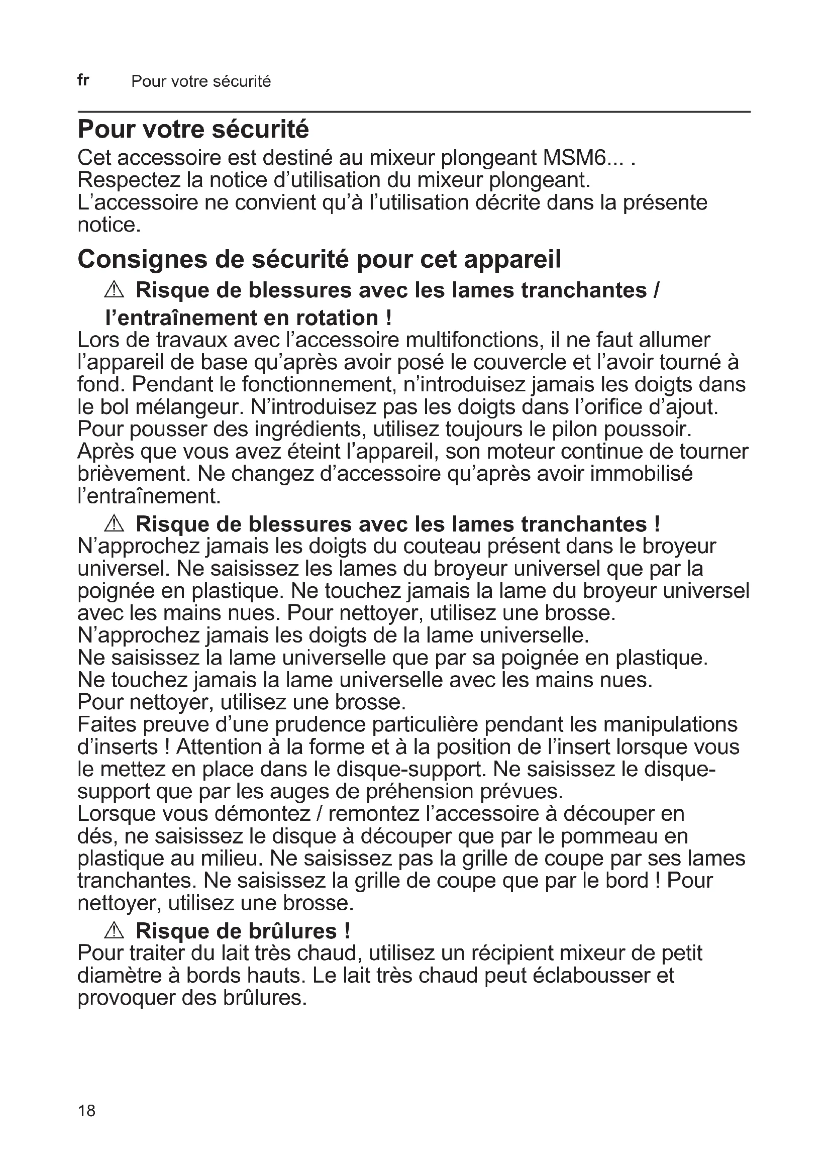 Pour votre sécurité Cet accessoire est destiné au mixeur plongeant MSM6... . Respectez la notice d’utilisation du mixeur plongeant. L’accessoire ne convient qu’à l’utilisation décrite dans la présente notice. Consignes de sécurité pour cet appareil A Risque de blessures avec les lames tranchantes / l’entraînement en rotation ! Lors de travaux avec l’accessoire multifonctions, il ne faut allumer l’appareil de base qu’après avoir posé le couvercle et l’avoir tourné à fond. Pendant le fonctionnement, n’introduisez jamais les doigts dans le bol mélangeur. N’introduisez pas les doigts dans l’orice d’ajout. Pour pousser des ingrédients, utilisez toujours le pilon poussoir. Après que vous avez éteint l’appareil, son moteur continue de tourner brièvement. Ne changez d’accessoire qu’après avoir immobilisé l’entraînement. A Risque de blessures avec les lames tranchantes ! N’approchez jamais les doigts du couteau présent dans le broyeur universel. Ne saisissez les lames du broyeur universel que par la poignée en plastique. Ne touchez jamais la lame du broyeur universel avec les mains nues. Pour nettoyer, utilisez une brosse. N’approchez jamais les doigts de la lame universelle. Ne saisissez la lame universelle que par sa poignée en plastique. Ne touchez jamais la lame universelle avec les mains nues. Pour nettoyer, utilisez une brosse. Faites preuve d’une prudence particulière pendant les manipulations d’inserts ! Attention à la forme et à la position de l’insert lorsque vous le mettez en place dans le disque-support. Ne saisissez le disque- support que par les auges de préhension prévues. Lorsque vous démontez / remontez l’accessoire à découper en dés, ne saisissez le disque à découper que par le pommeau en plastique au milieu. Ne saisissez pas la grille de coupe par ses lames tranchantes. Ne saisissez la grille de coupe que par le bord ! Pour nettoyer, utilisez une brosse. A Risque de brûlures ! Pour traiter du lait très chaud, utilisez un récipient mixeur de petit diamètre à bords hauts. Le lait très chaud peut éclabousser et provoquer des brûlures.19 Pour votre sécurité